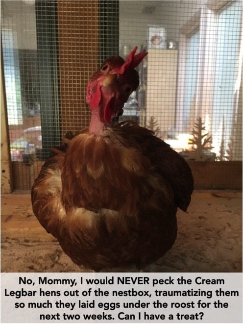 3) Suck it up and cull the mean little freeloaders. (Their brothers were SUPER mean as well - meanest little chickens I ever raised, picked fights with everyone form a very early age.) This is the first thing I thought when watching them going after Arbequina. But if I can get them laying again, I do enjoy the blue eggs, and they were well behaved with a cockerel around.