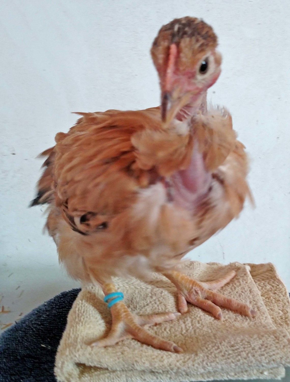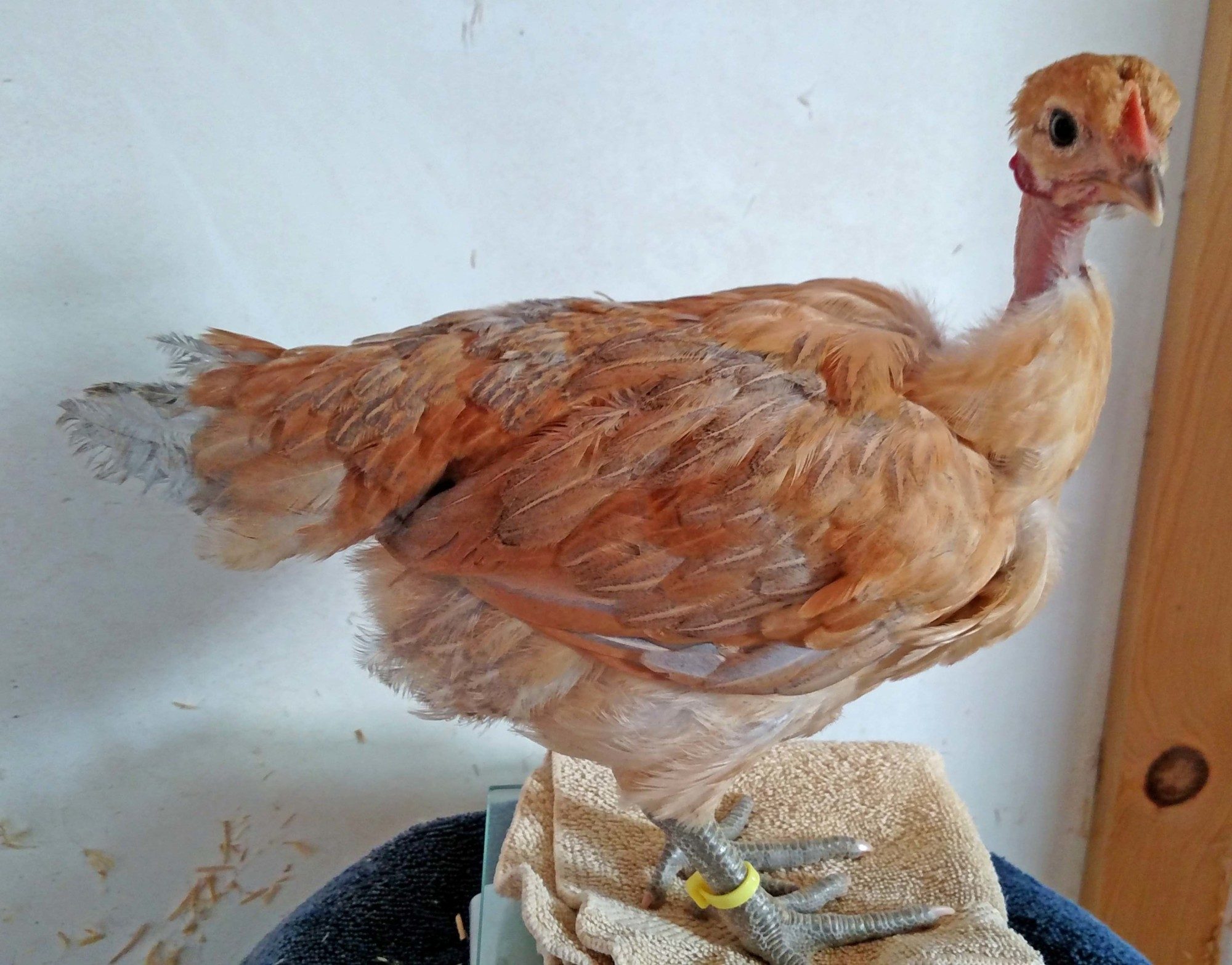 Nugget (as is gold nugget and chicken nugget, LOL!). His legs have a bit more of a green tint than I would like, but I'm hoping his golden buff coloring remains fairly clean so I can possibly show him. He's a throw-back to his grandfather, but with a much better disposition, and he's the slowest one to feather out with a nicely dense, meaty body.