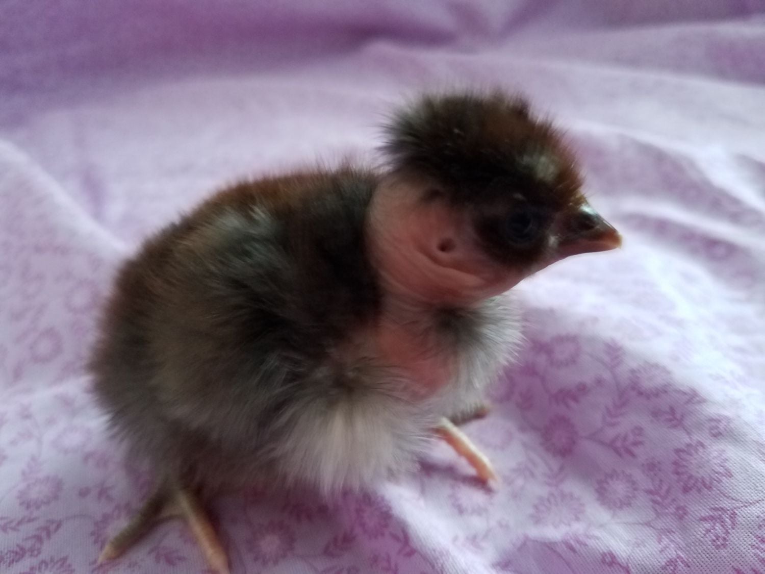 Check this out. One of draye's babies had a similar coloring. Blue in there. It's going to be pretty too. Tummy shot. :D Blue... Here's a couple of shots of his crew that I got. His blacks, are black! The darkest black I've gotten in a chick in a long time. Very pretty. :) There is a feathered baby at the right.