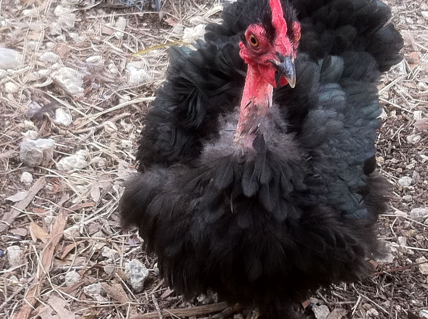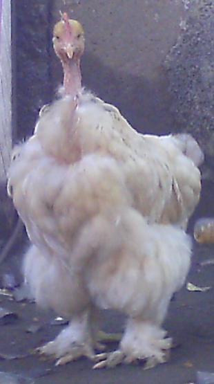 Here is a picture of one of our sweet Bantam Feather Footed Frizzled Naked Necks :)