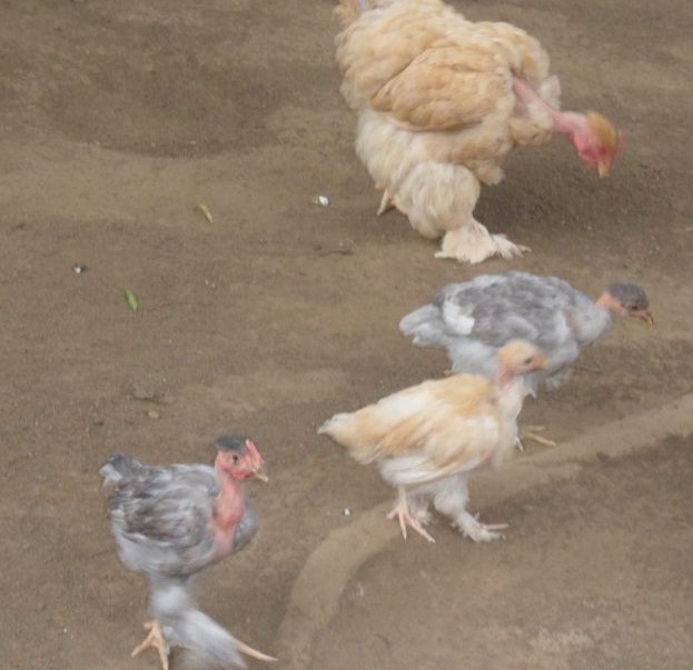 this blue cockerel was mated back to her mother. and produced 3 chicks.. 1 naked neck buff pullet with bow tie, 1 naked neck blue pullet with bow tie and 1 fully naked neck(no bow tie) cockerel.. pics coming soon...