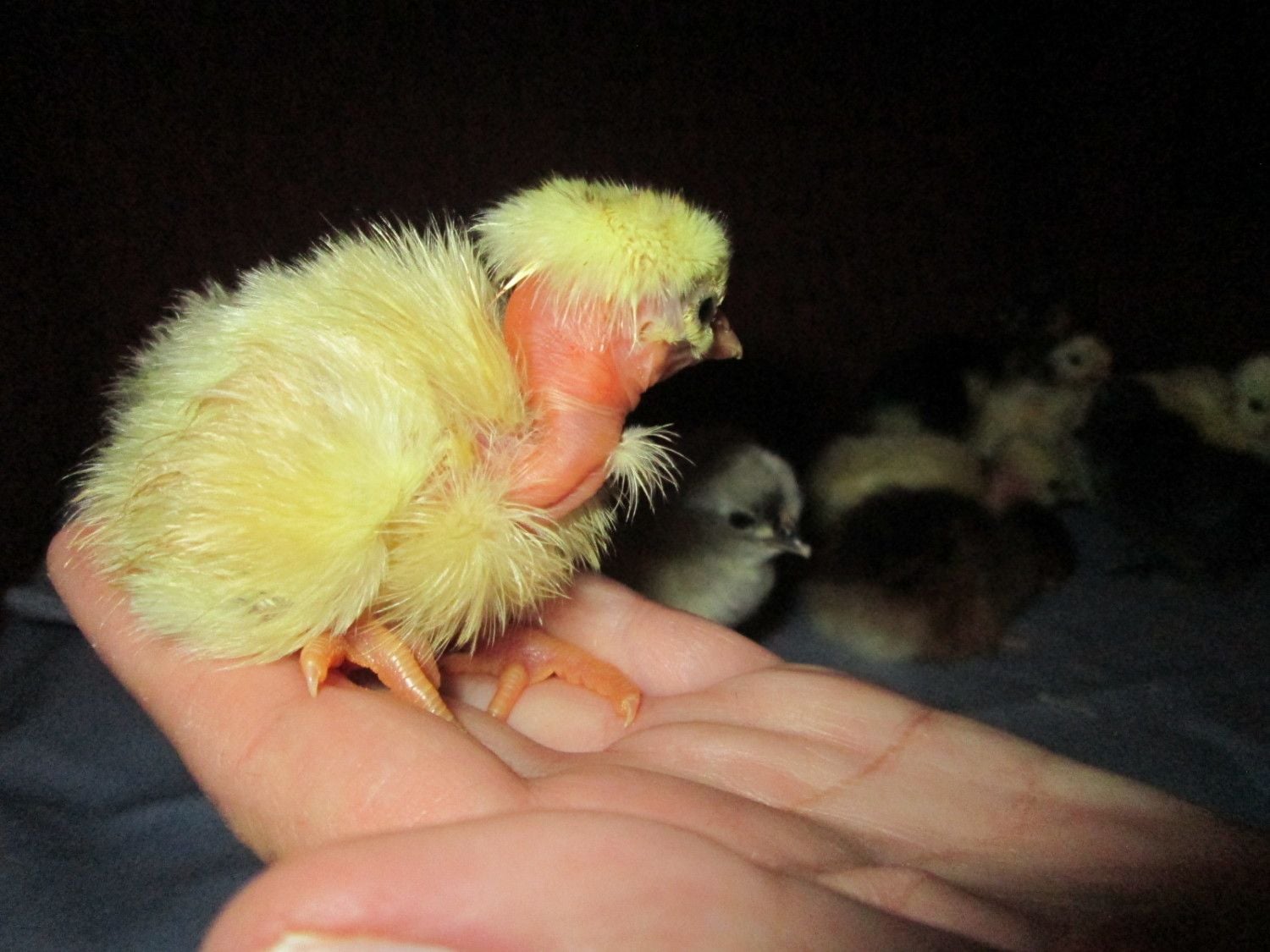 I have babies tonight, and they aren't supposed to hatch until Fri.! Wow, they are healthy little/big things. Here are some pictures, and I have a question on one, don't laugh, remember, this breed is new to me. The last one that I have pictured, has a dark spot on the head, it also has some dark on the back of the neck, so wondering..if it is just pigmentation..since there is black feathering.
