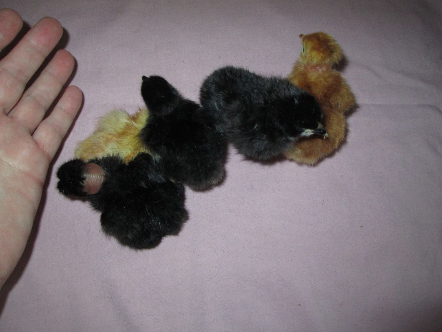Cynthia12 said: More babies, from a different breeder than the last I just hatched. Group shot, three NN's, two not.. A little red She has a little bit of black on top of her head. Three little NN's So sweet Click to expand... Cute chicks.