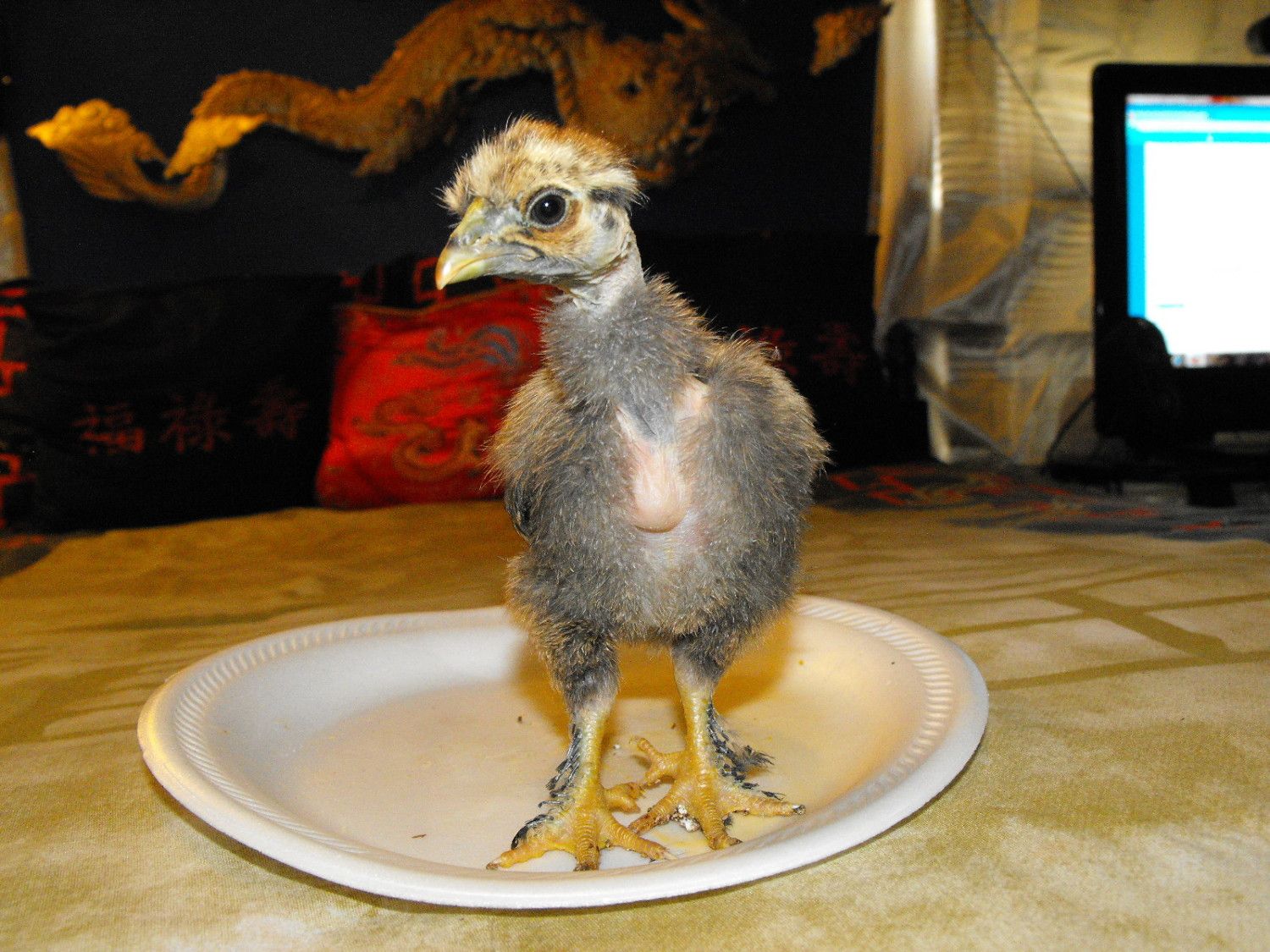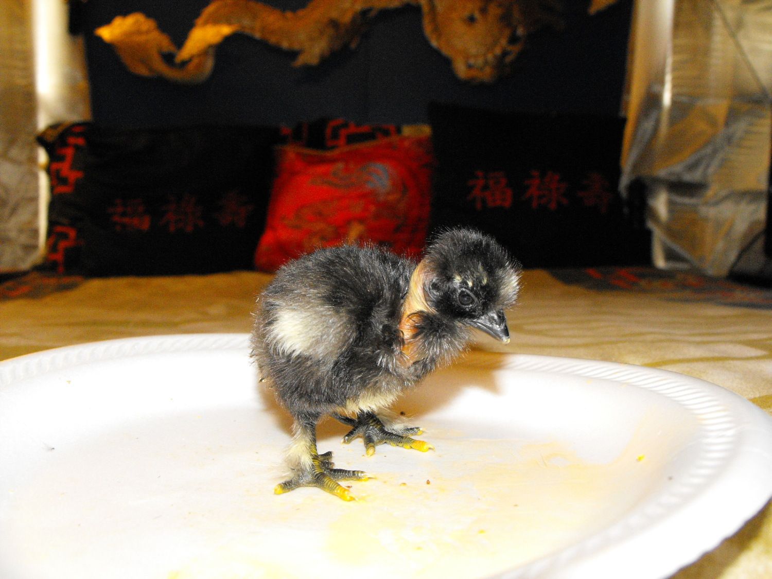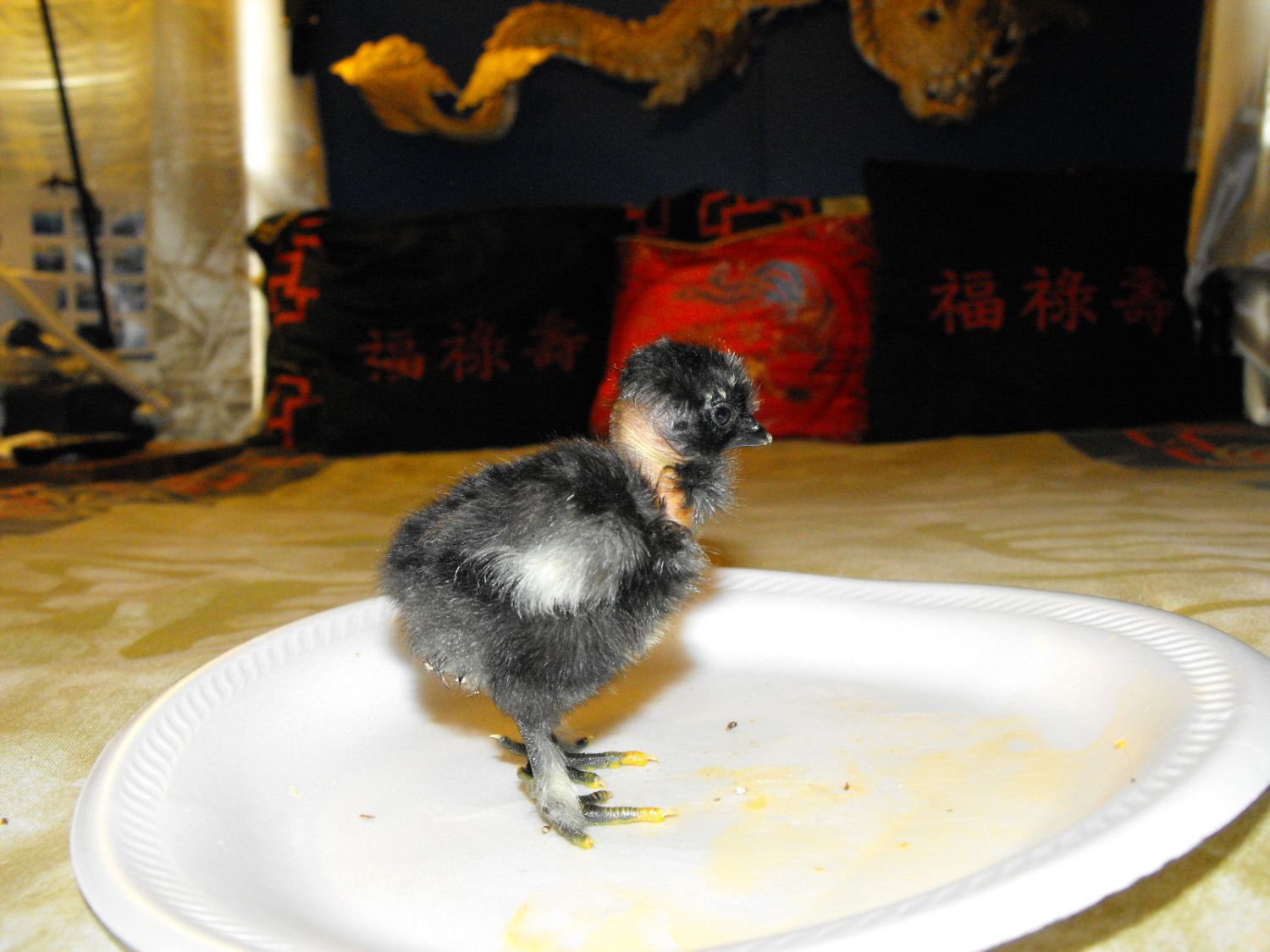 The little black chick actually has dark skin except for the neck. From the neck back it is purple skinned, also its head is purple skinned.