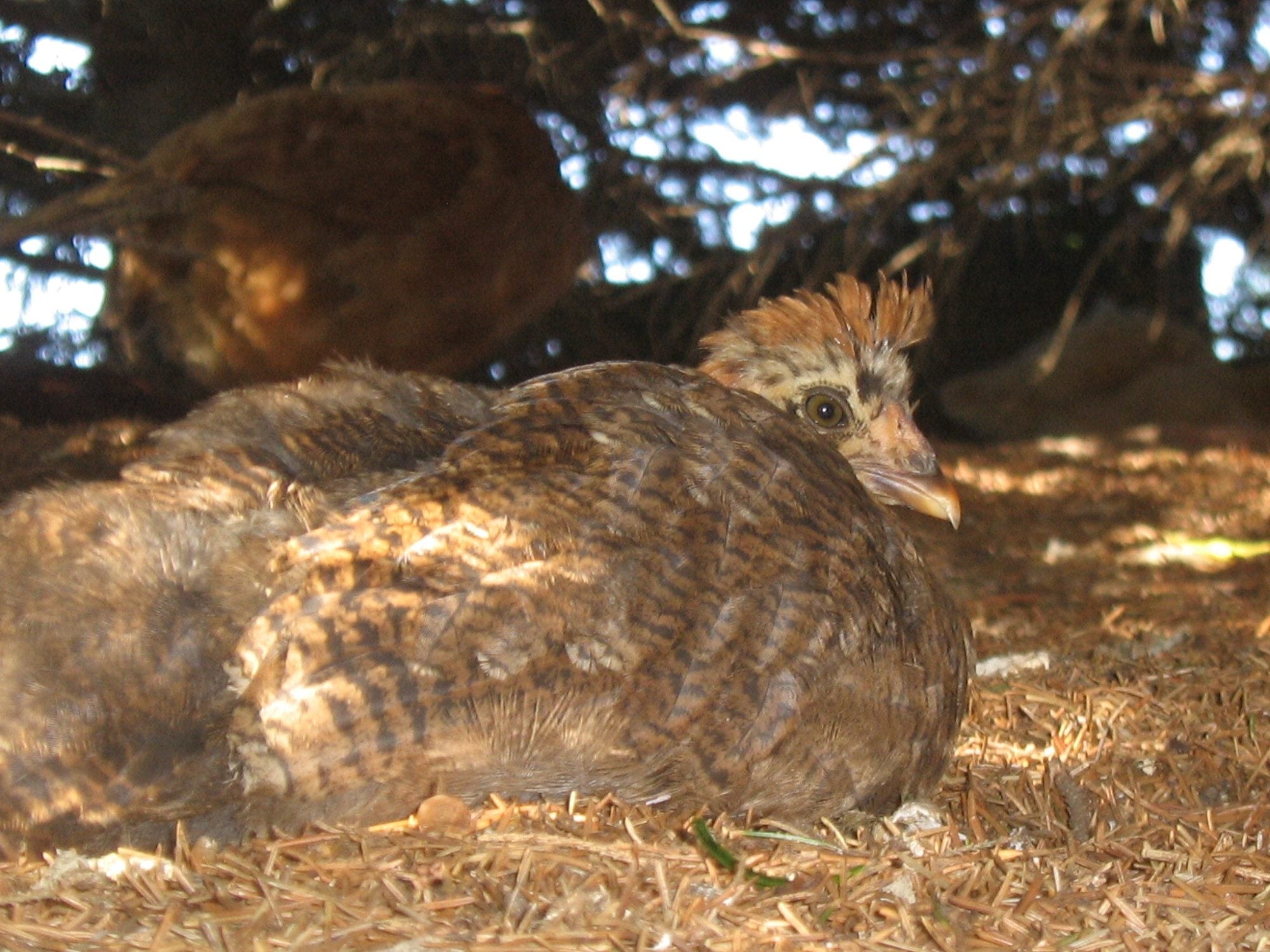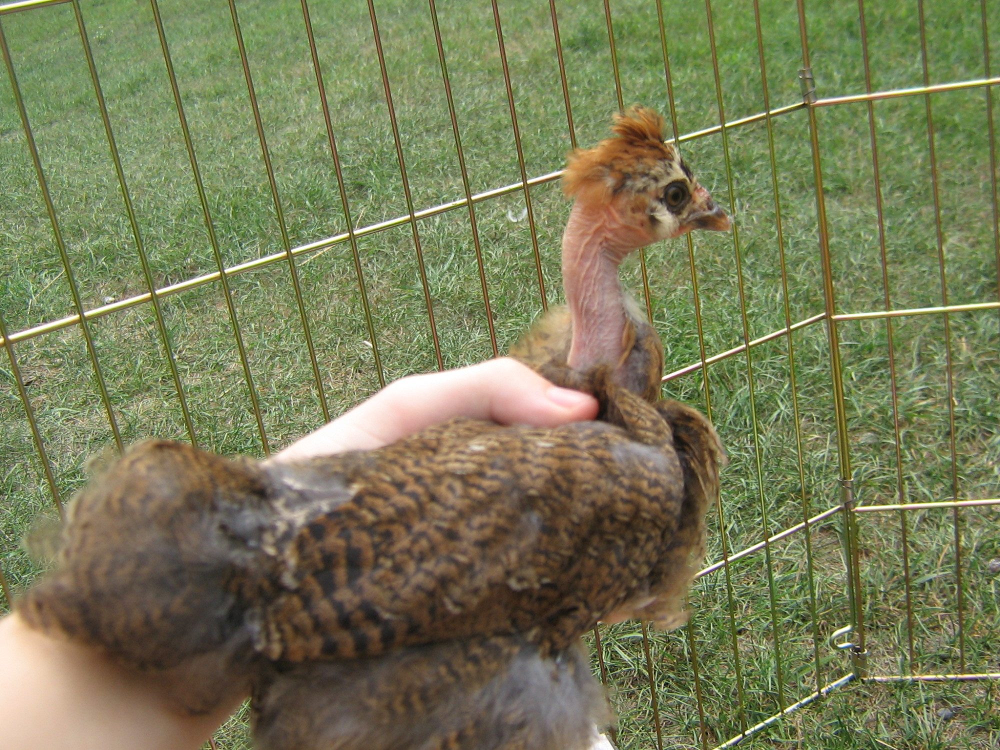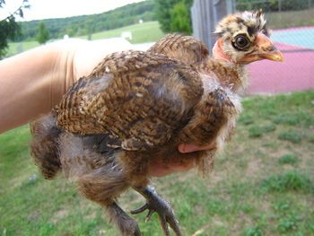 ) and I found Teddy all wet laying down about 2 feet from the hens. It's like every timeone hatched they moved... but Teddy was cold, not moving, and limp. I picked her up and her little naked neck was dangling, so I thought she was dead. I yelled for my dad and he came... I told him she was dead and he said I should get rid of her (we were going to burry her). I wasn't 100% sure she was dead, so I put her uder the girls. It was such a miriacle!!!! She was slower than the others the first few days, but I'm so happy she made it