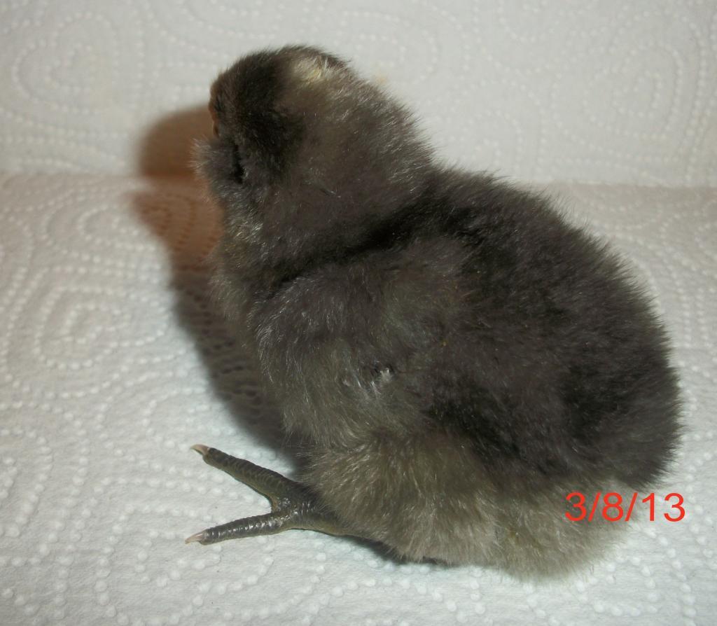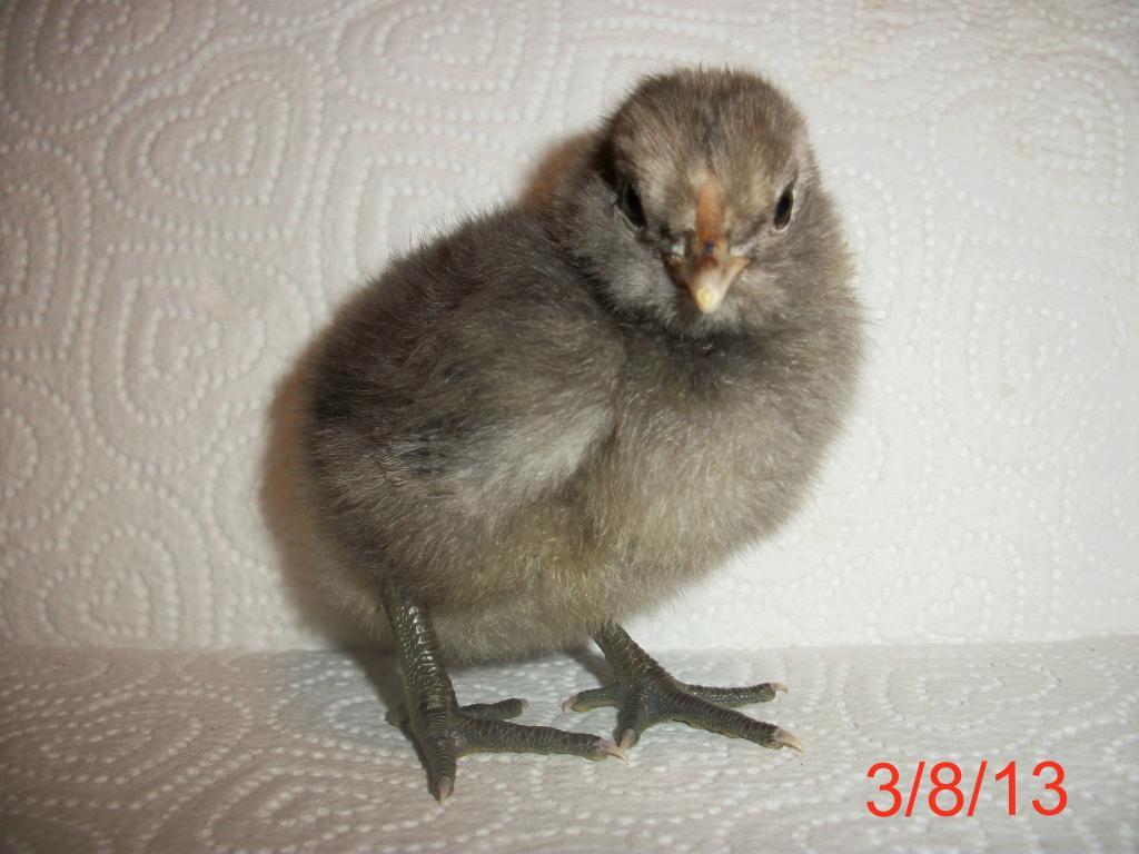 And this is a very special chick; cuckoo / barred, pea-ish comb, beard muffs, blue egg gene, slate legs : )