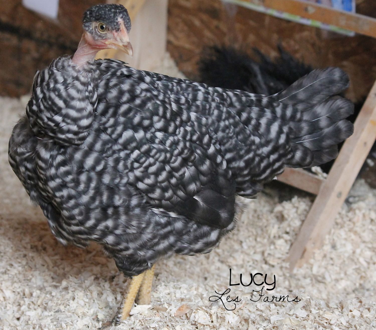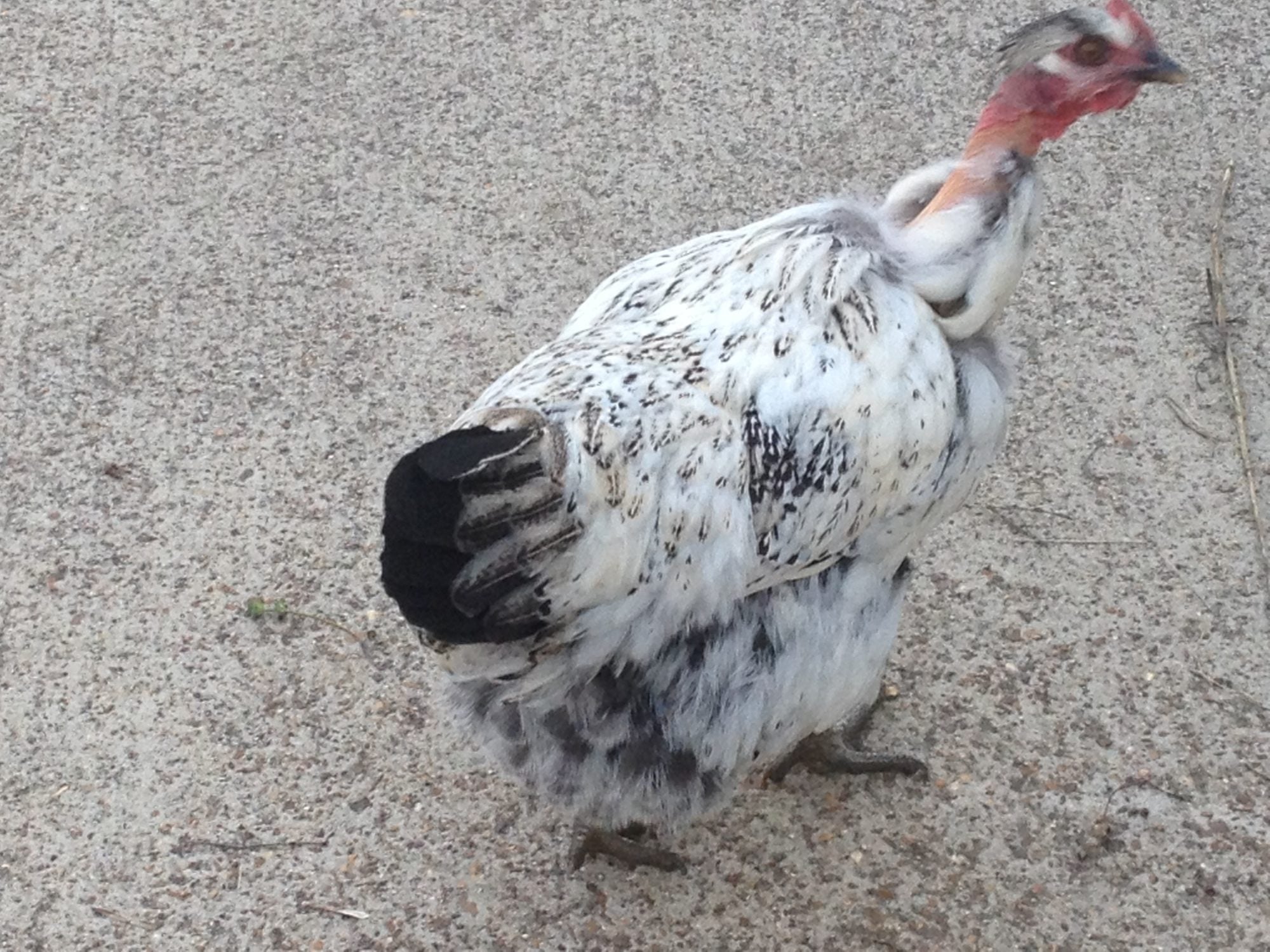 The black tail might be slightly better because she already has the genes for clearing most of the body of black, her tail shows partial blackness but either hen will work for your project.