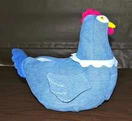 I've just finished a chicken doll for the raffle. She's made of denim and has an egg channel so that you can help her lay an egg. She comes with a tie-dye looking egg that has a baby chick inside.