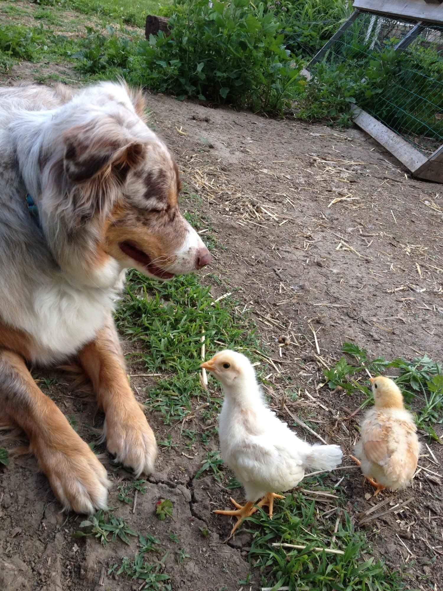 The other is Peach and I have no idea what she is. She has white earlobes but lays dark brown eggs. She is a good chicken and loves Lena. I think that Peach and Banana imprinted on Lena and even now Peach follows her around the backyard, cleans her fur, shares the yummy bits and marrow in a smoked femur bone. Peach might think that she is a dog.