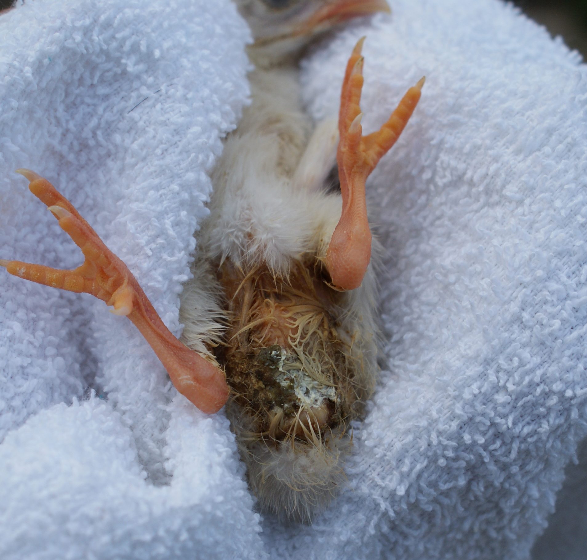 I have added photos of the wet area before and after i clean them off .. this baby is not dead in the photo but may be by tomorrow if i can not figure out what is wrong before I can get it or a dead one to the vet for a necropsy and have a stool sample checked