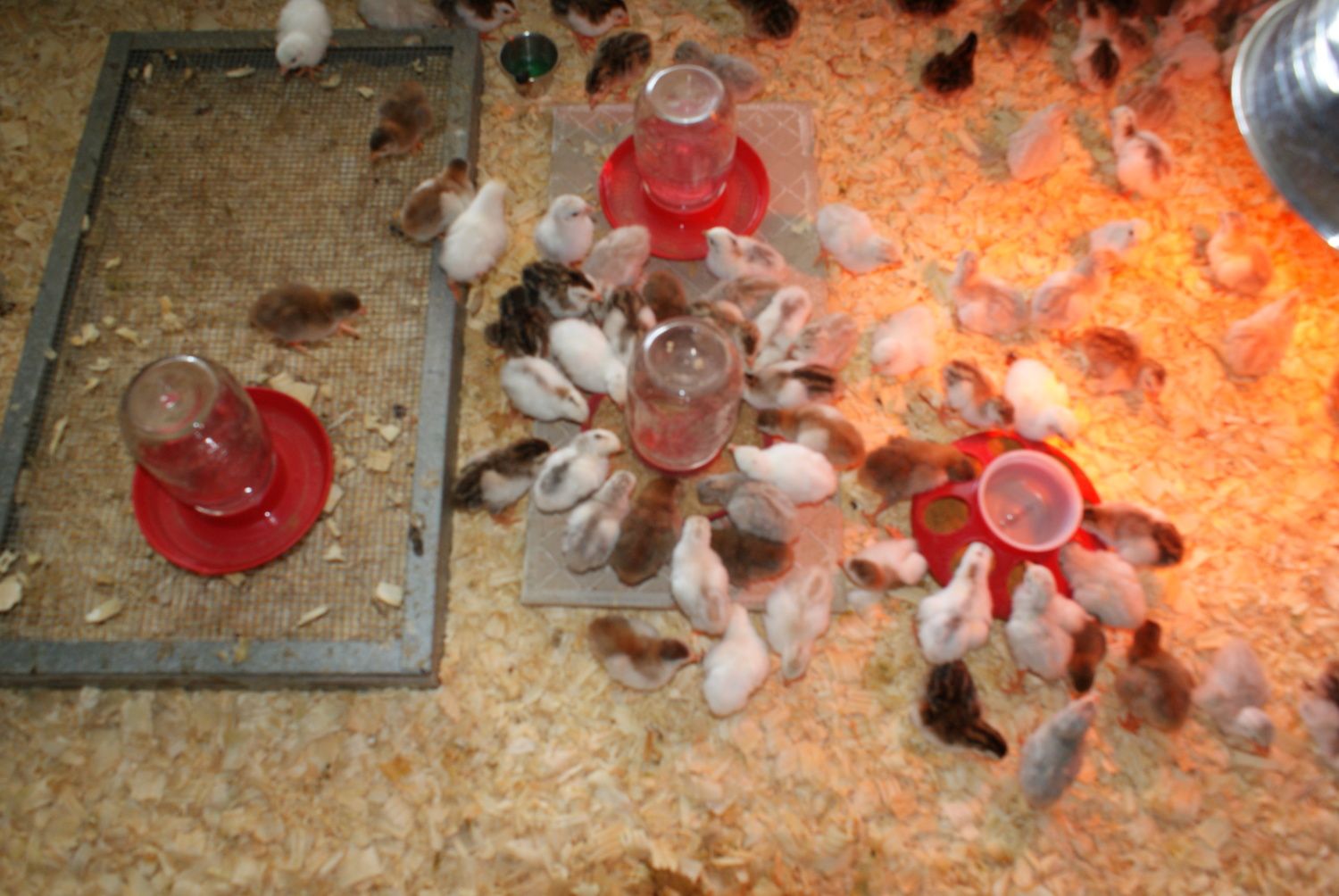 the brooder is a 4 by 8 feet with 1 heat lamp at one end and a regular 40 watt bulb on the other end , i do not run the heat lamp during the day we do not need it , they are no other animals of any kind around them