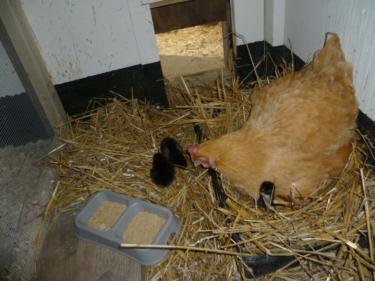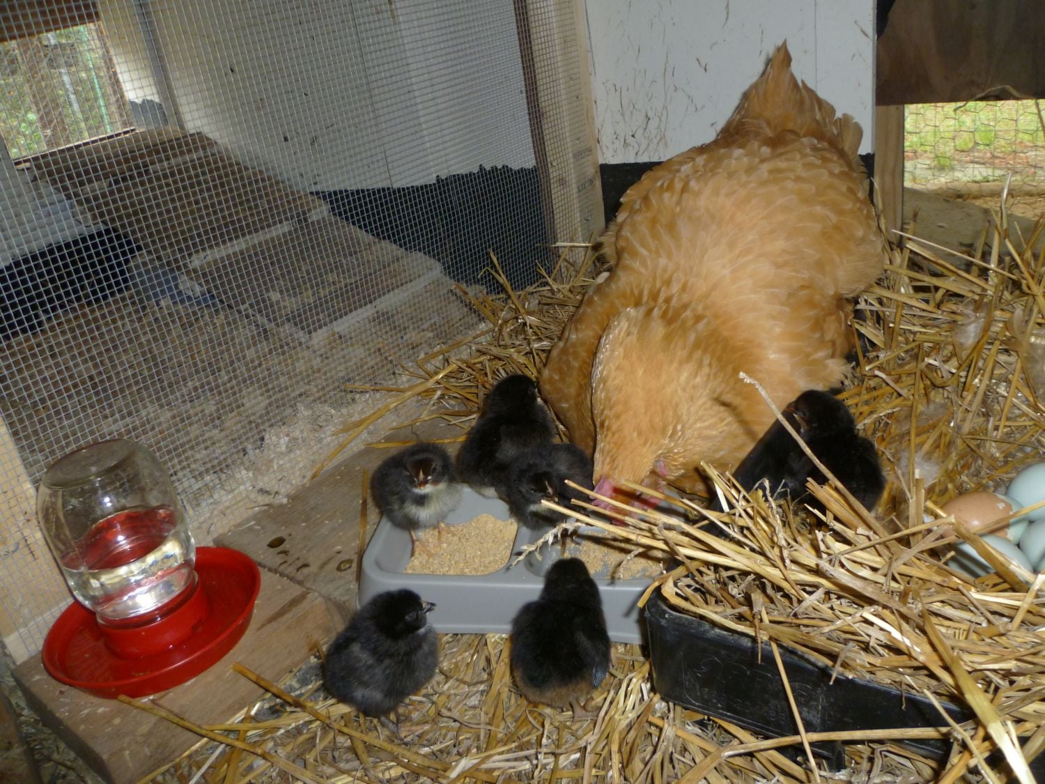 PS I did put a small amount of chick feed and a small waterer in with them so she could take care of them while she sits on the others. She did take them outside this morning for about 3 minutes. They have food and water outside in their private area too.