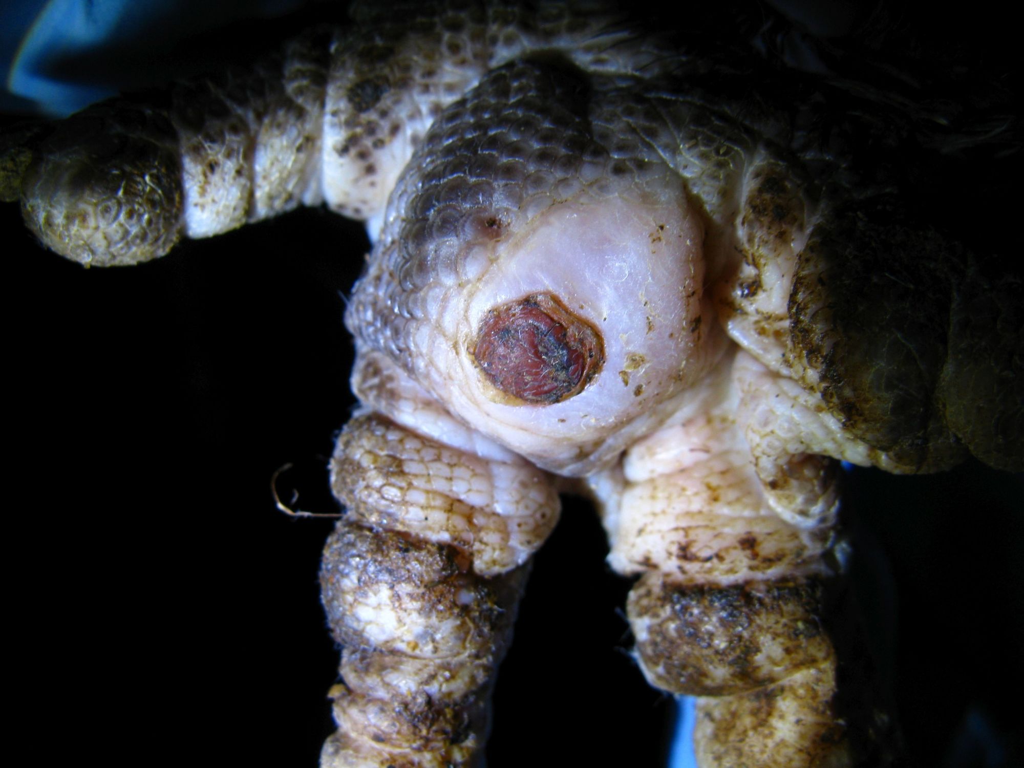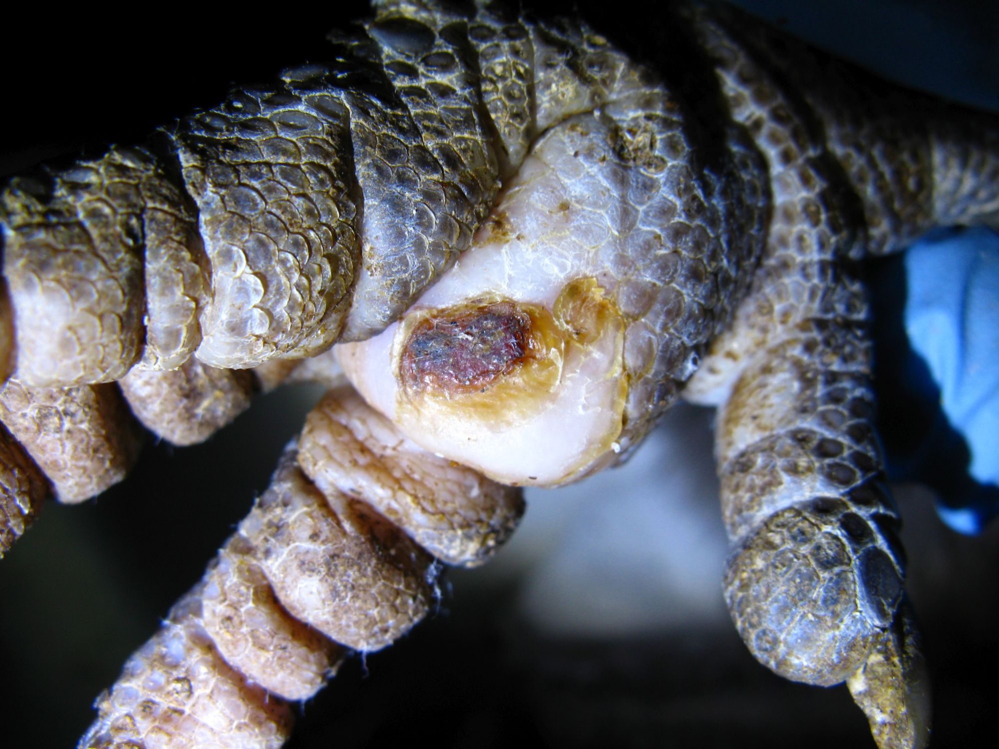 A couple weeks ago, I discovered bumblefoot on both feet of one of my chickens. I tried doing the surgery treatment, and got out a bunch of stringy pus from both feet, though I was unable to find kernels. I packed the open wounds with neosporin, put gauze on and wrapped her feet in vet wrap. I've been cleaning her feet and re-wrapping them every other day, and while the new scabs look redder than they did before (previously they were completely black), her feet have not healed yet. I'm not sure how long this should take or if I need to go back in her feet and dig around again. Here is a picture of each foot: