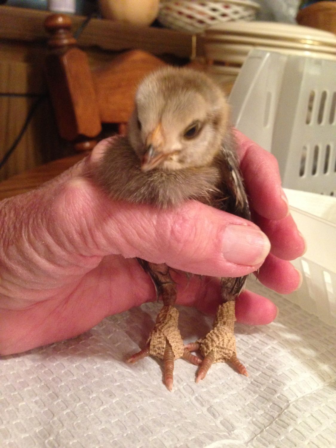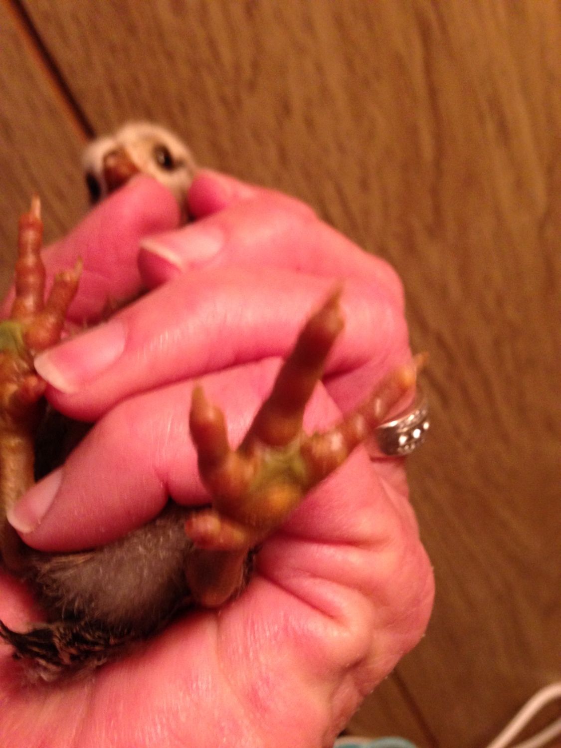 I wish you all the best in this fight against frostbitten feet. One thing I would suggest is not to give her bread. The jury is still out, but many people have said that bread can cause sour crop, and she has enough of a battle without that too. I don't know if it does or not, but why risk it just in case? HOWEVER, I would recommend some Poly-Vi-Sorb vitamins - basically some baby vitamins and get the one without iron) and the easiest way I've found to give a drop or two of that is ----yep, a couple of drops on a small crust of bread. She'll scarf it down and not even know it's on there, so you don't have to worry about trying to hold her, open her beak, get it in and avoid having it go down the wrong pipe. So while I don't recommend giving a lot of bread, we're just talking one tiny little bit - for medicinal purposes only.