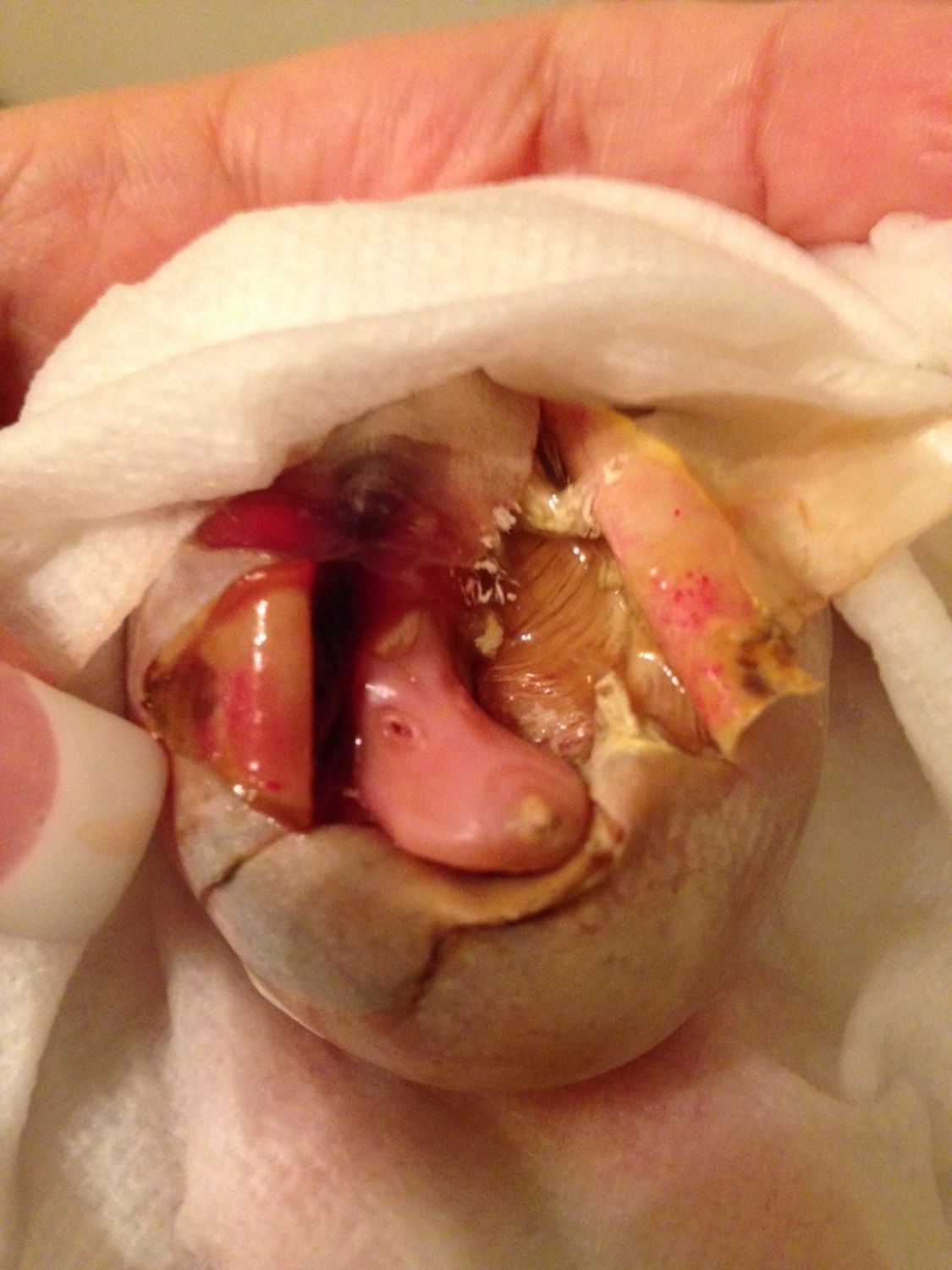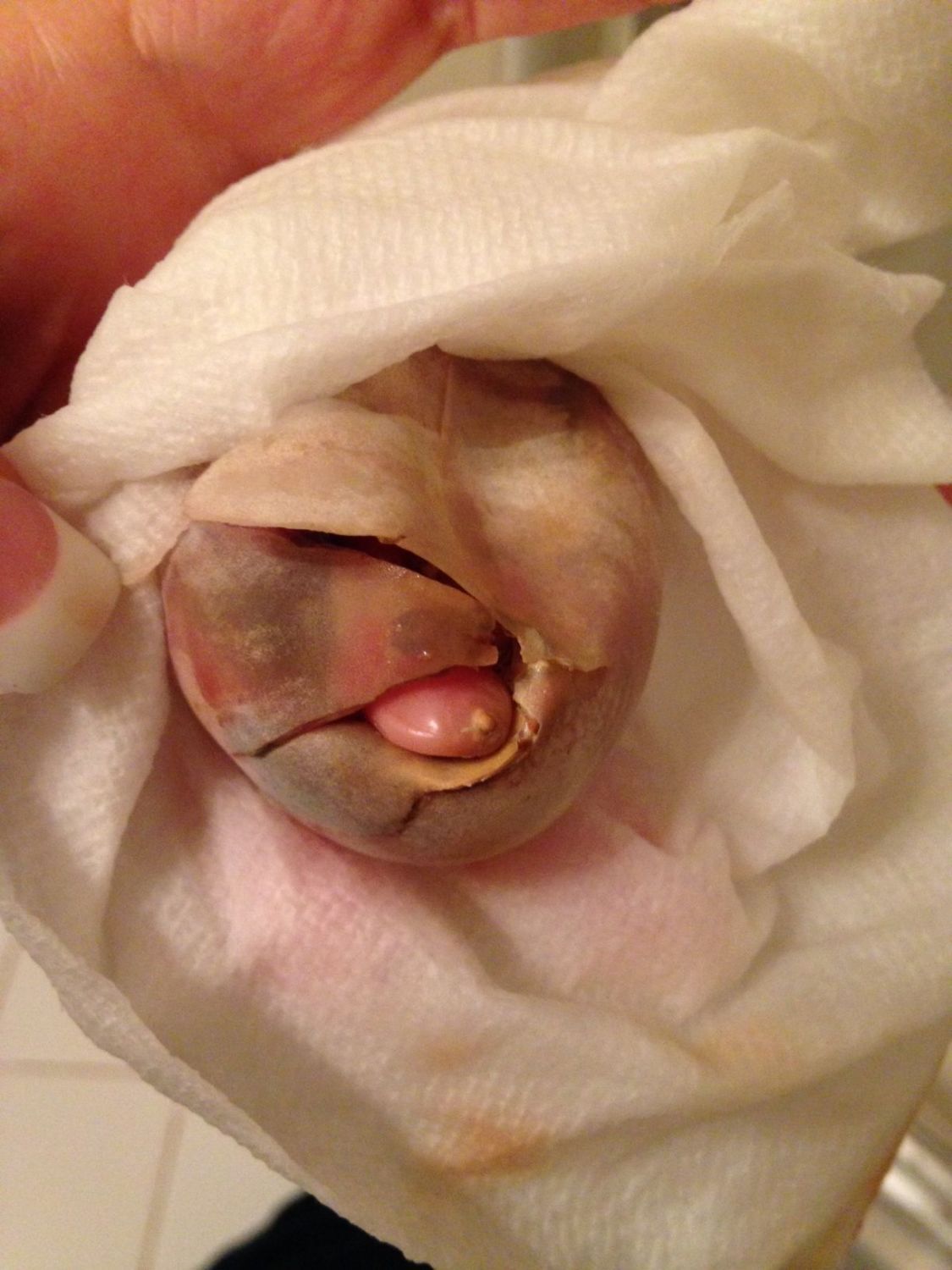 If anyone who has gone through this has any advice about how best to know WHEN to start intervening, I'd appreciate it. I am about to leave for three hours (I have no choice; I'd get fired if I don't make it to this dinner and it's an hour away--and back). I am going to look at the membrane (or try to) when I get back and decide whether to start cutting away at the membrane. By then, it will have been 48 hours since he initially "pipped" the hole in the wrong side. I'm most afraid that his position keeps him from doing the struggle he needs to do to "close" the veins and absorb the yolk. I can't see through the outer membrane to see if there is anything there or even how the rest of his body is positioned.