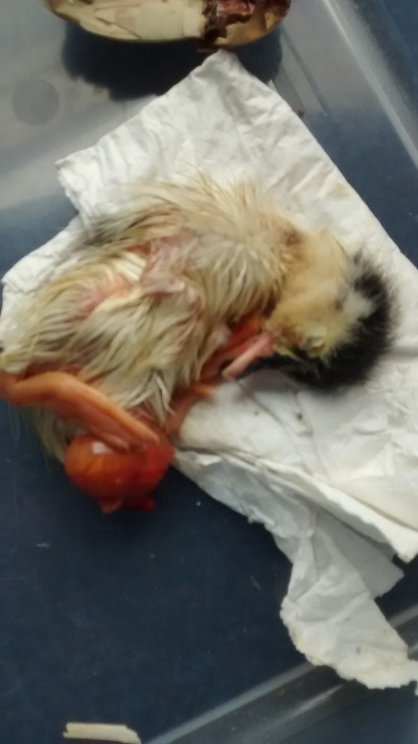 The little one is still alive but not well... It seems to have part of its intestine outside body.. Coming out its butt :(.. It is missing an eye and cant move its body below the neck.. Makes me mad.... We will see if there is anything I can do for it,,, But it looks bad..