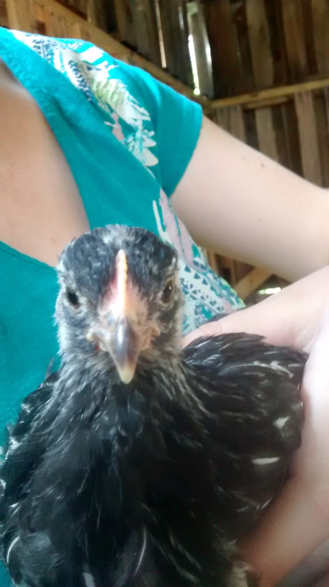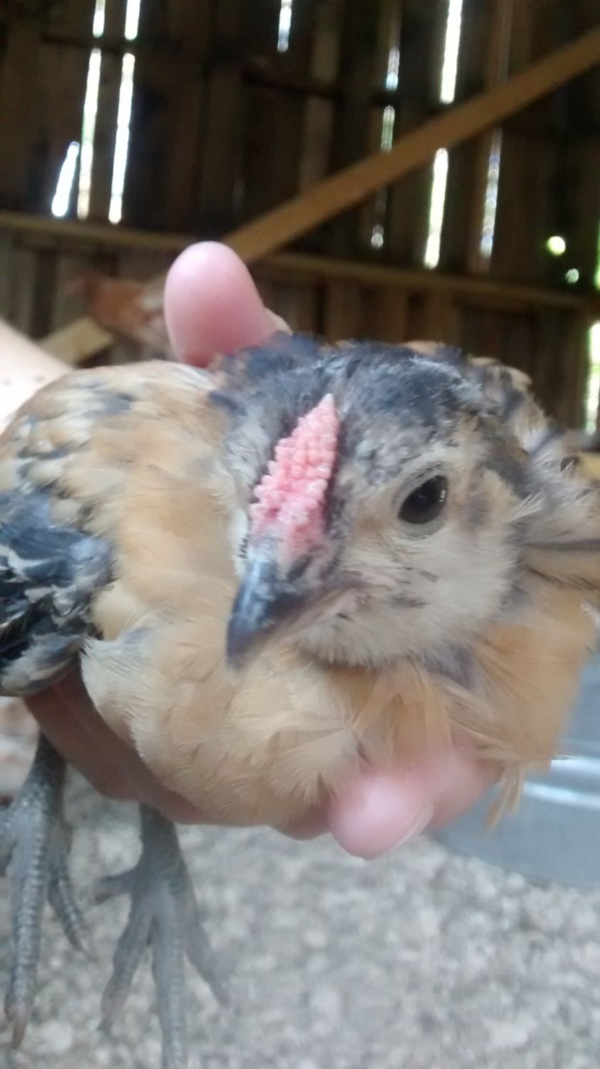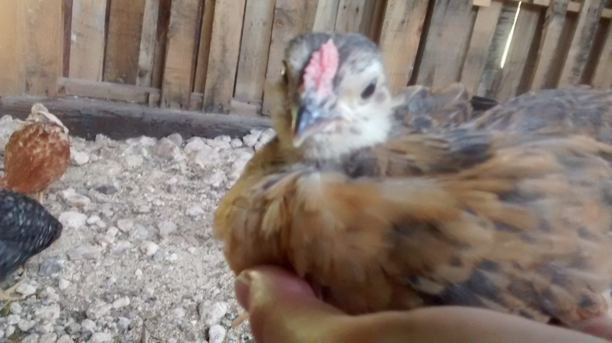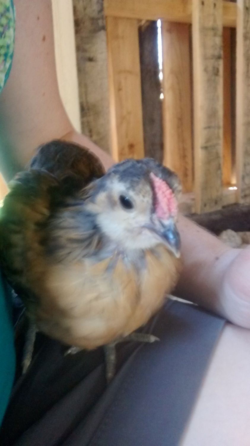 Bantam #3 - Sweet, friendly, likes to be held. All the Bantams are a little wary of the larger, standard size chicks I have (aged 7wks and 8wks) but except for the usual pecking order, they make out just fine and are not picked on badly. I'm thinking it may be a Quail Belgium Bearded d'Anver. This one does not seem to have a beard, though. I have five of these that, as day-old chicks, looked all alike, but now some of them look different than the others..