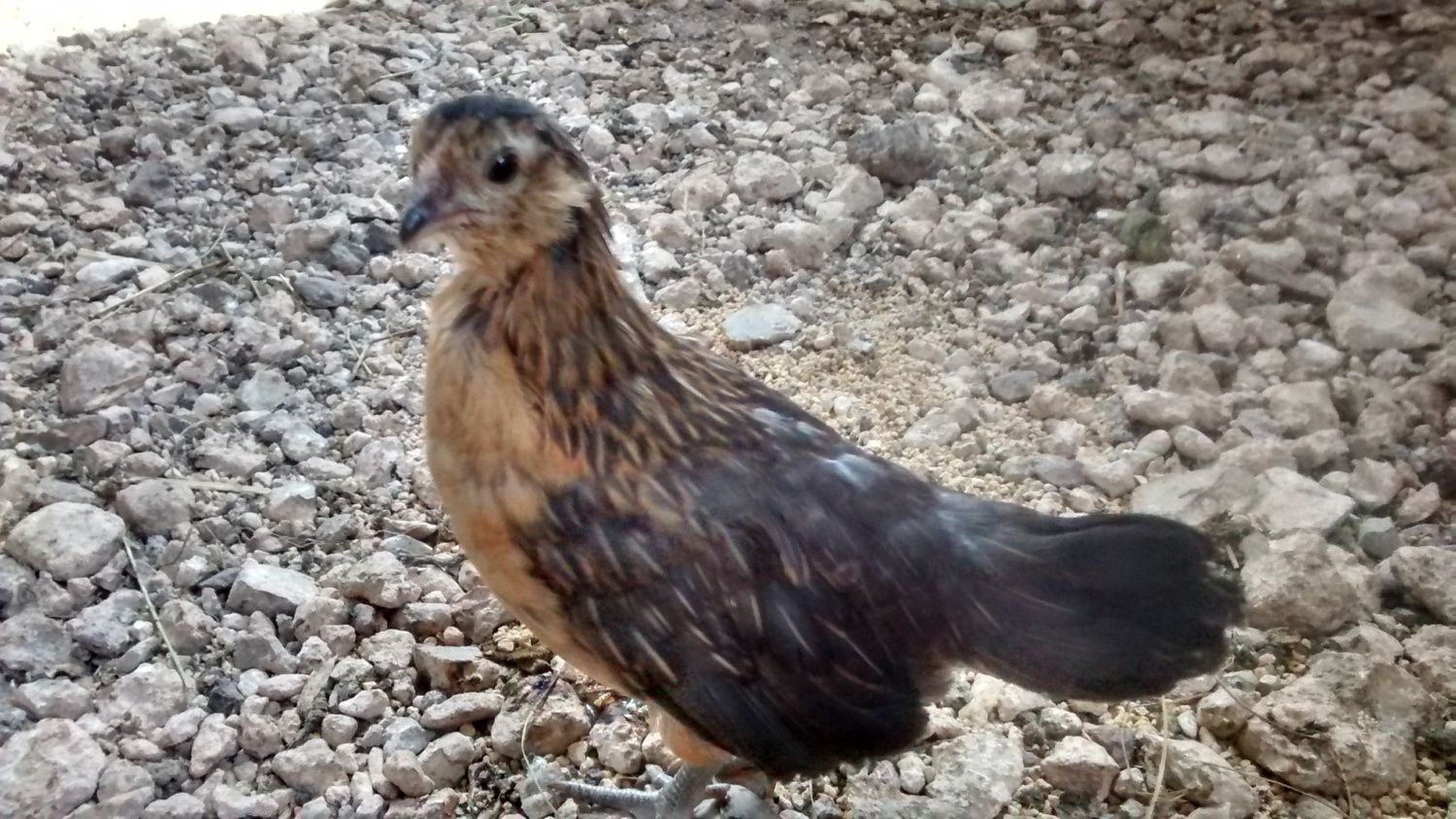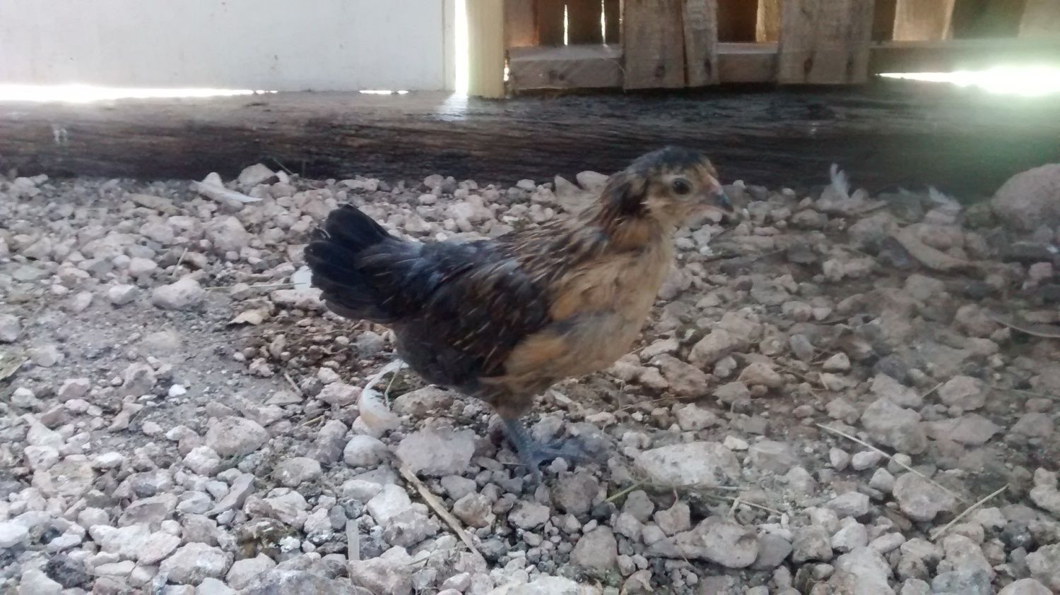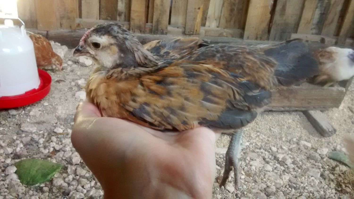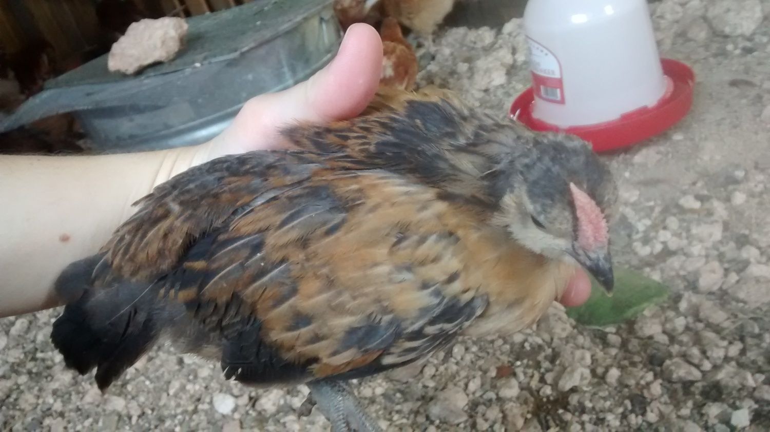 Bantam #3 - Sweet, friendly, likes to be held. All the Bantams are a little wary of the larger, standard size chicks I have (aged 7wks and 8wks) but except for the usual pecking order, they make out just fine and are not picked on badly. I'm thinking it may be a Quail Belgium Bearded d'Anver. This one does not seem to have a beard, though. I have five of these that, as day-old chicks, looked all alike, but now some of them look different than the others..