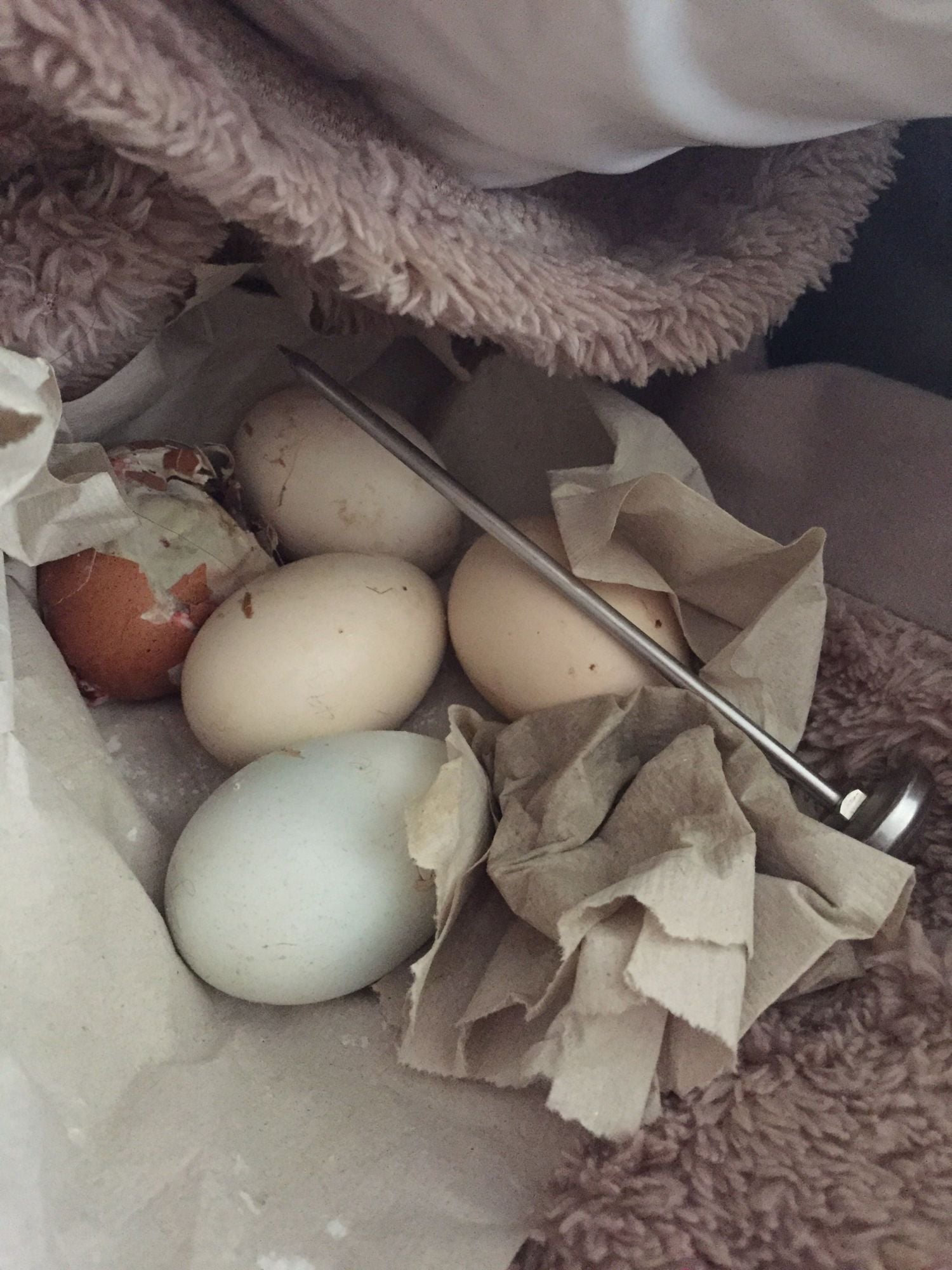 Right now, I have eggs and hatchling in a heating pad nest with a slightly damp paper towel and a meat thermometer. I've never tried incubating and hatching myself. I've read up on it, but I know in practice, it's going to be harder. The hatchling's shell is badly cracked (mama probably did in in trying to save it from ants before she left the nest), but the membrane is still supple. I don't hear any activity from the other eggs and I don't see any visible signs of pipping.