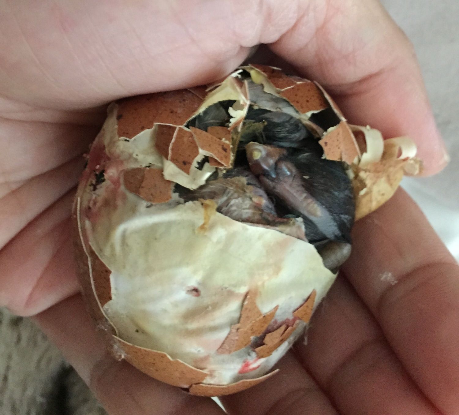 Anyways, two hatched successfully, but there are 5 more eggs. Mama abandoned nest to care for hatchlings and also to save them from the aggressive ants. The eggs were cold to the touch, but I know that she only had been off for less than 1.5-2 hours. One egg is partially hatched and ants started to attack already. I cleaned them all up and tried unsuccessfully to put them back under mama, but the other 2 chicks are running around a bit and I'm certain the ants will be back and attack again.
