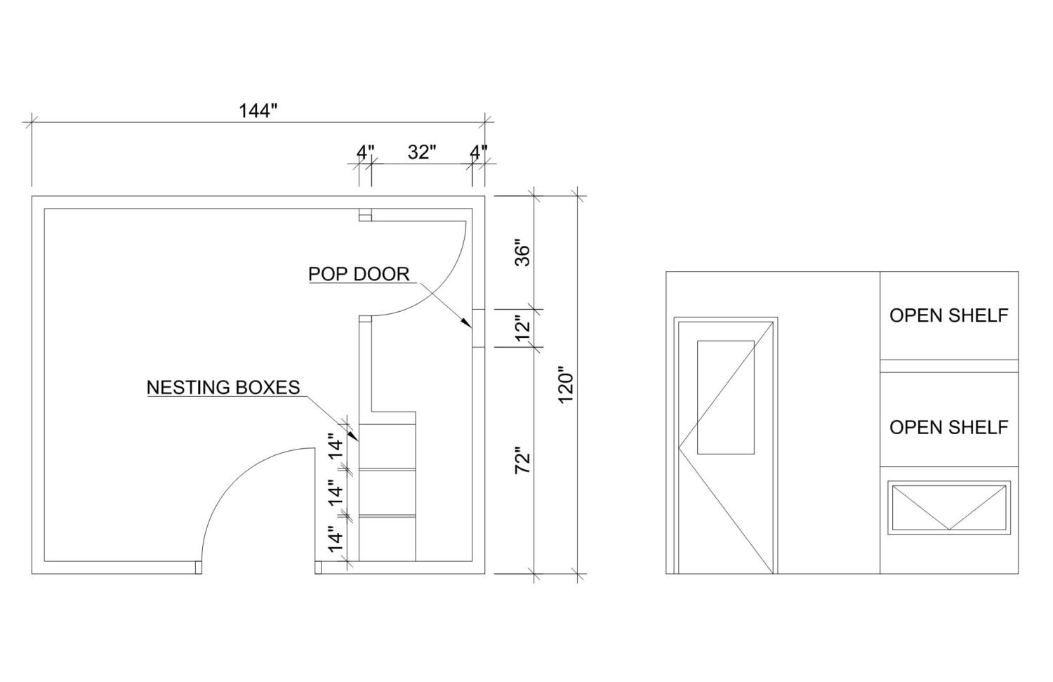 I posted a few weeks ago regarding possible options to house our chickens at our new abode. We determined that it would be best to section off part of the existing shed and modify it to house our lovely ladies. These are the primitive plans I've come up with. I just sketched up something quick in AutoCAD, so please don't judge the draftsman skills