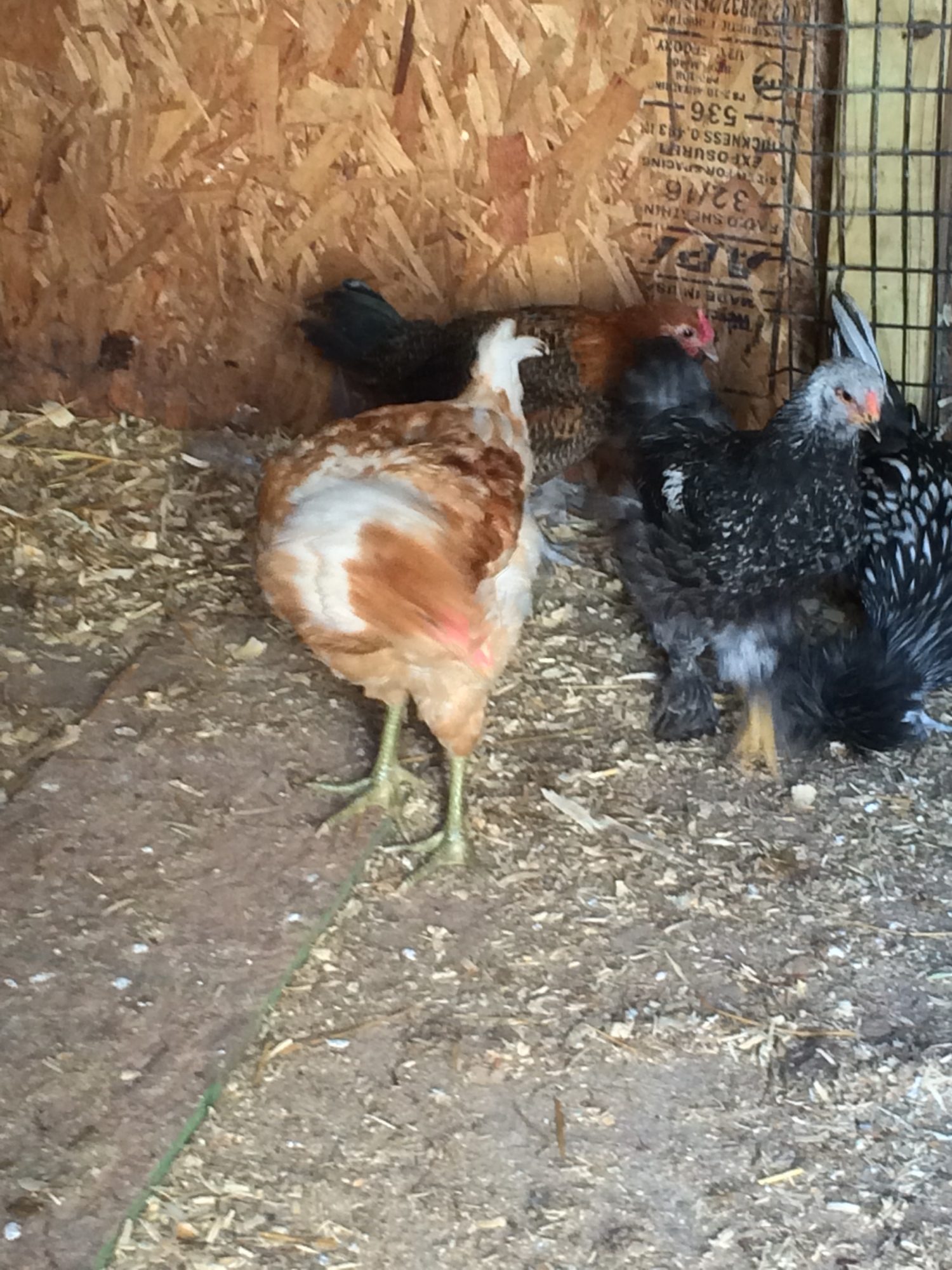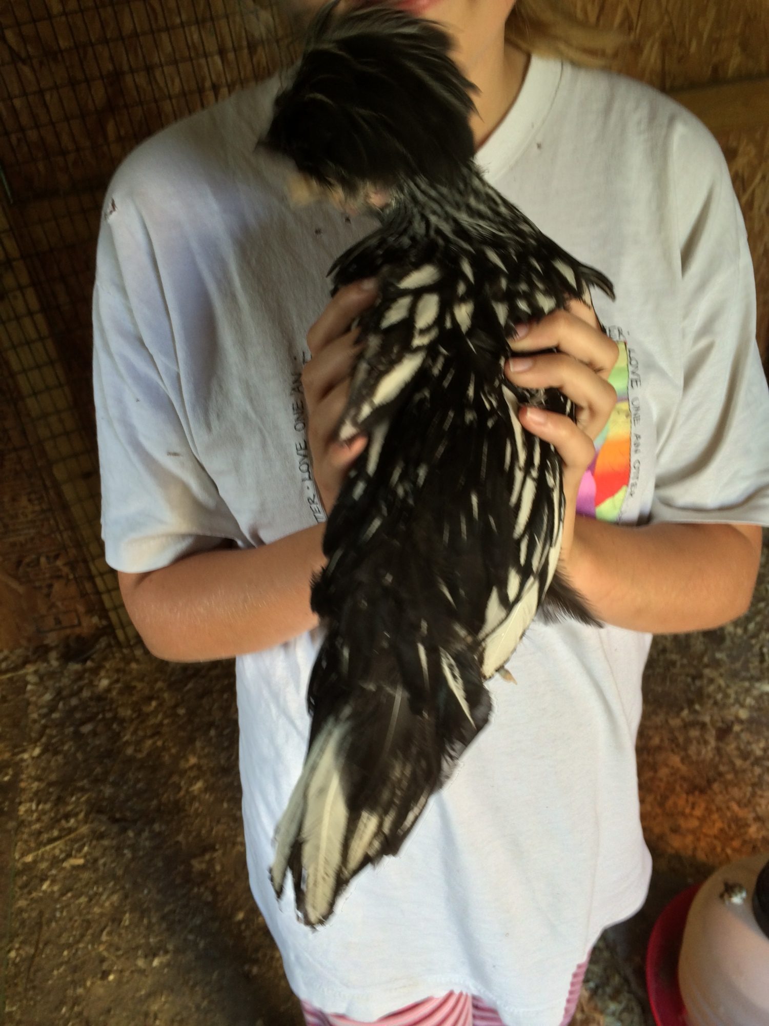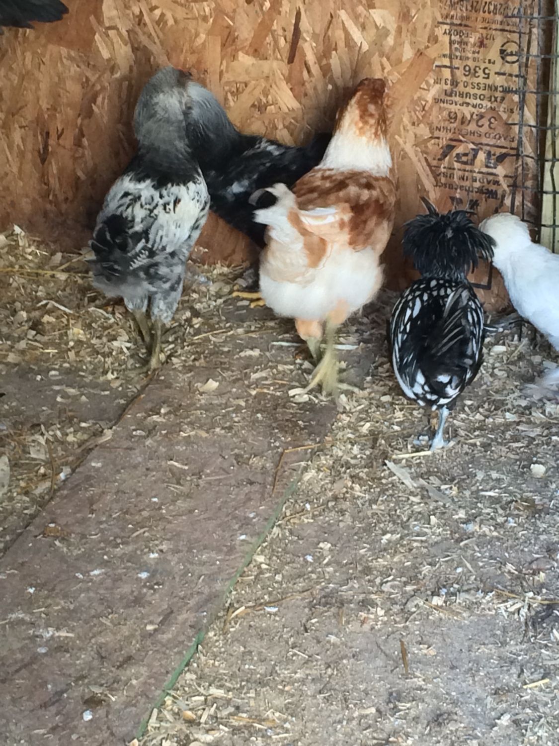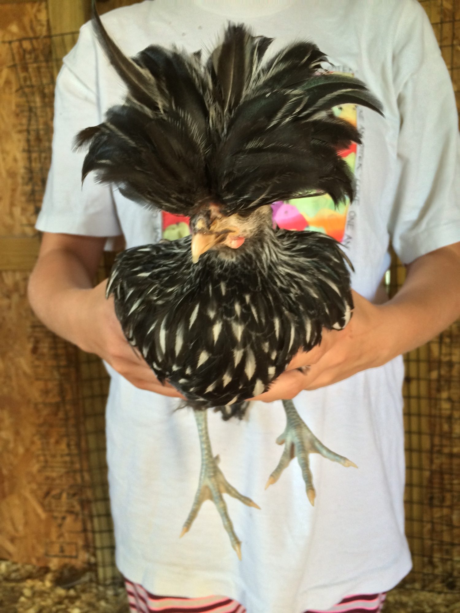 Sass looks like a Silver Laced Polish and I'm thinking cockerel. No Name is a Dark Brahma, cockerel. I'm thinking that Snowball is a Splash Cochin pullet.