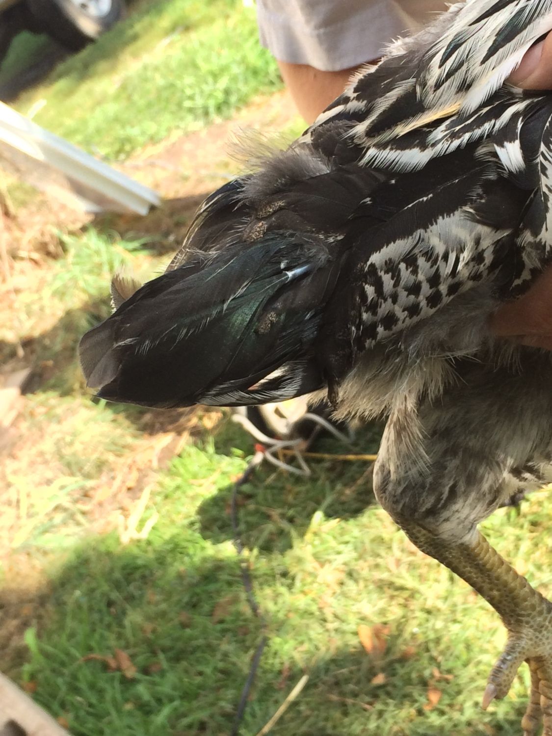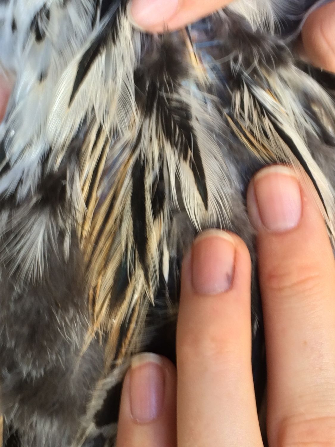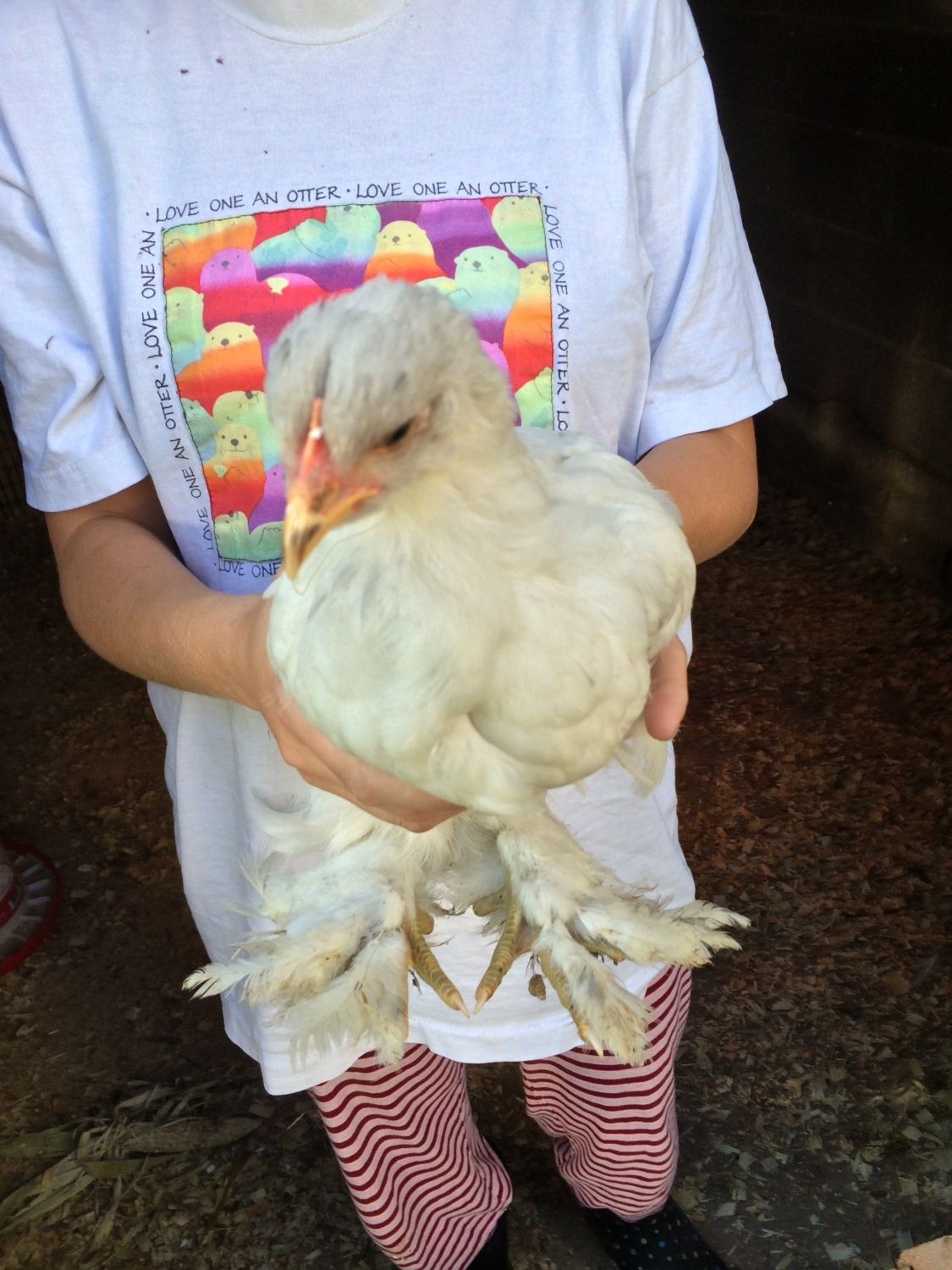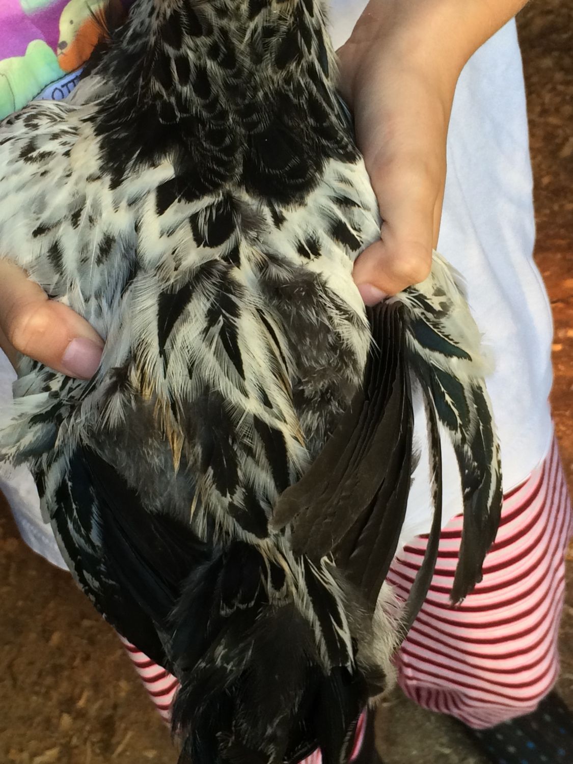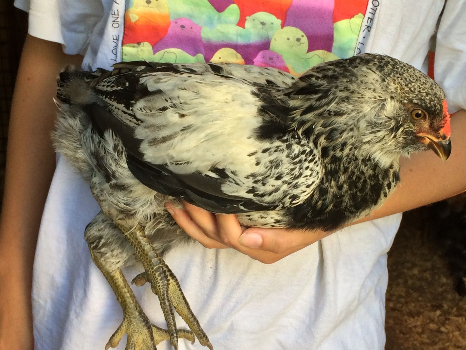 Sass looks like a Silver Laced Polish and I'm thinking cockerel. No Name is a Dark Brahma, cockerel. I'm thinking that Snowball is a Splash Cochin pullet.