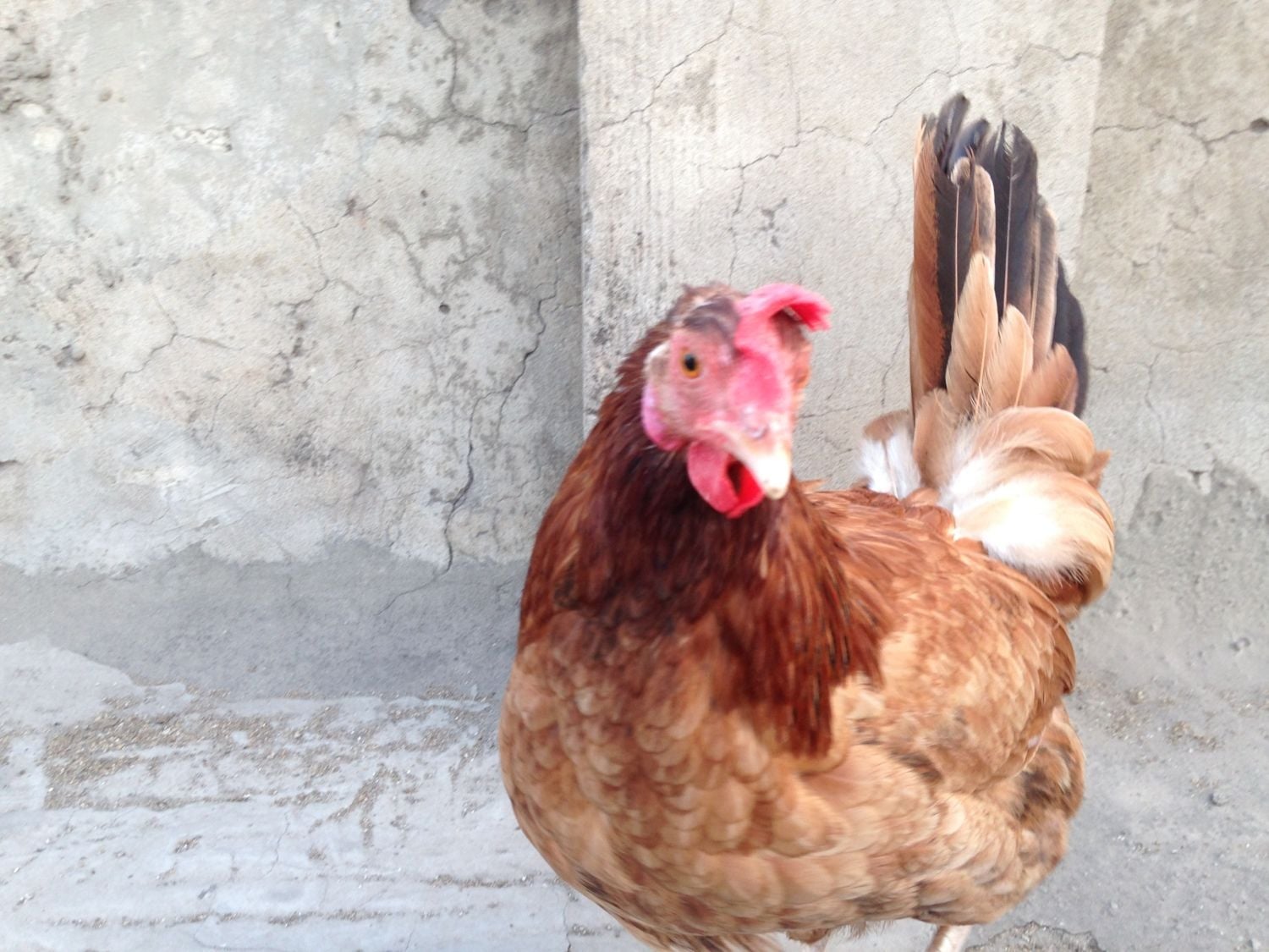 To me she looks like a fighting game chicken mixed with "local chickens".