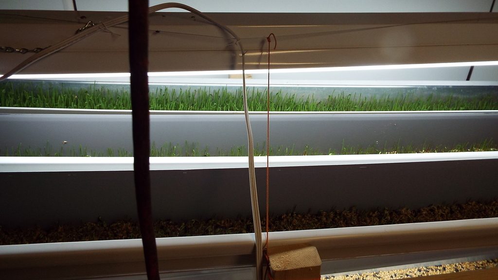 I was unable to get a pic of the whole system because the space it's in is a bit small and cramped. It's a shed that is climate controlled but has no ambient light. I added some florescent lights because the fodder wasn't greening well.