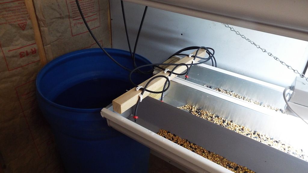 In the morning, I harvest a gutter, clean it out, distributed the soaked grains, and start the soak on tomorrow's grains and top off the water barrel with a garden hose. In the evening I top off the barrel. I spend less than 30 minutes a day total.
