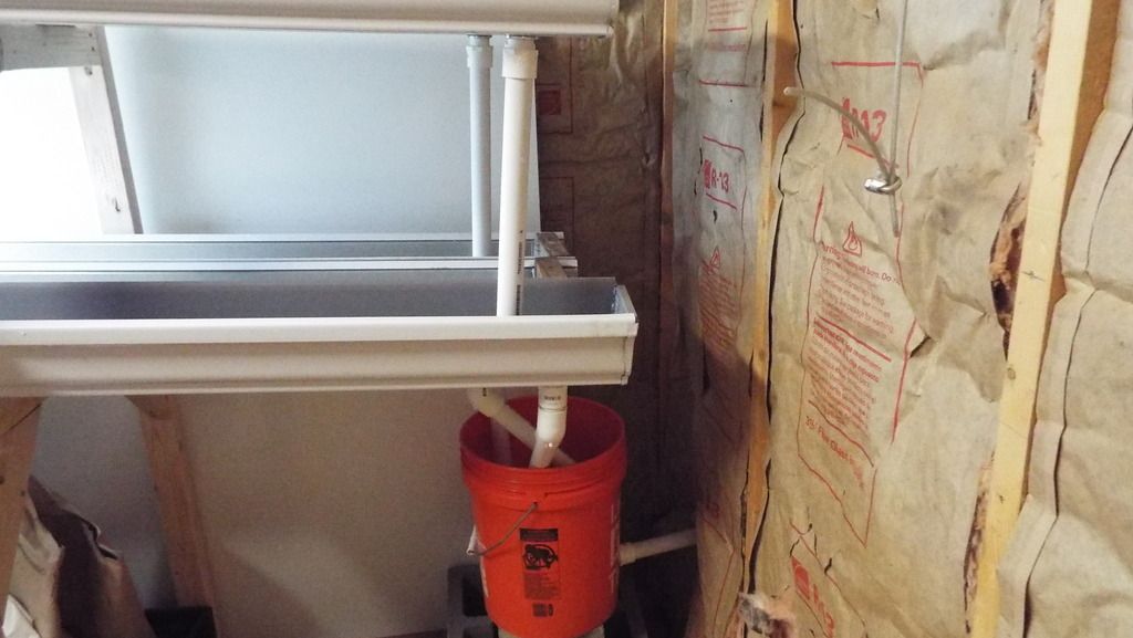 The top gutters drain into the bottom gutters which drains into a bucket that is piped outside to fill a water barrel. We use that to water the garden.