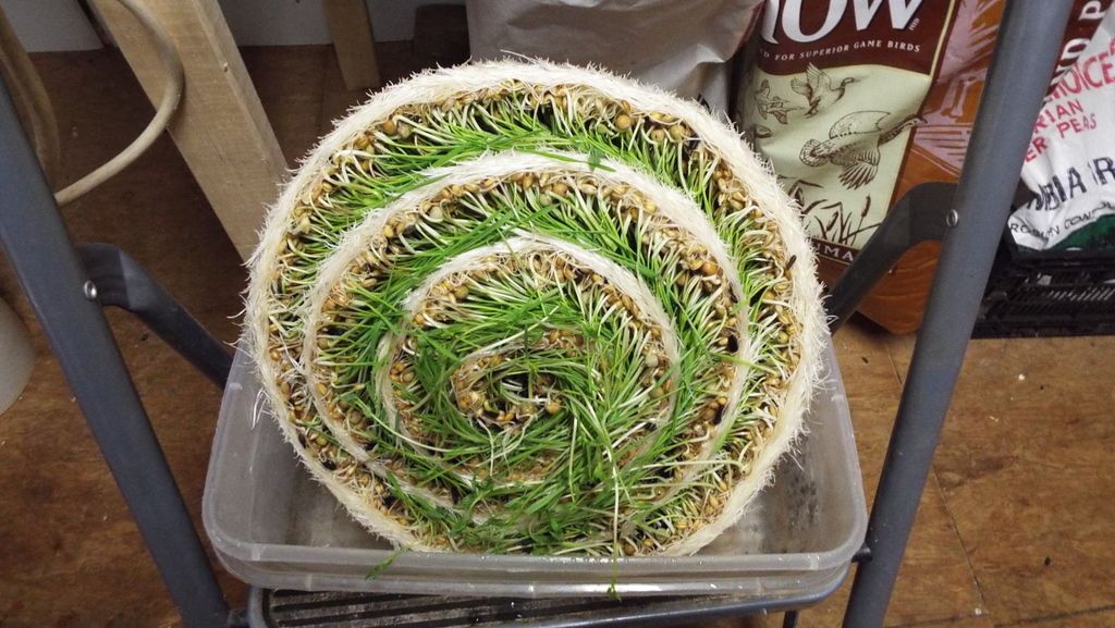 For my flock of 19 girls, each day I provide 3 cups of dry grains soaked in water for 24 hours and then sprouted in my automatically watered gutter system for 6 days.