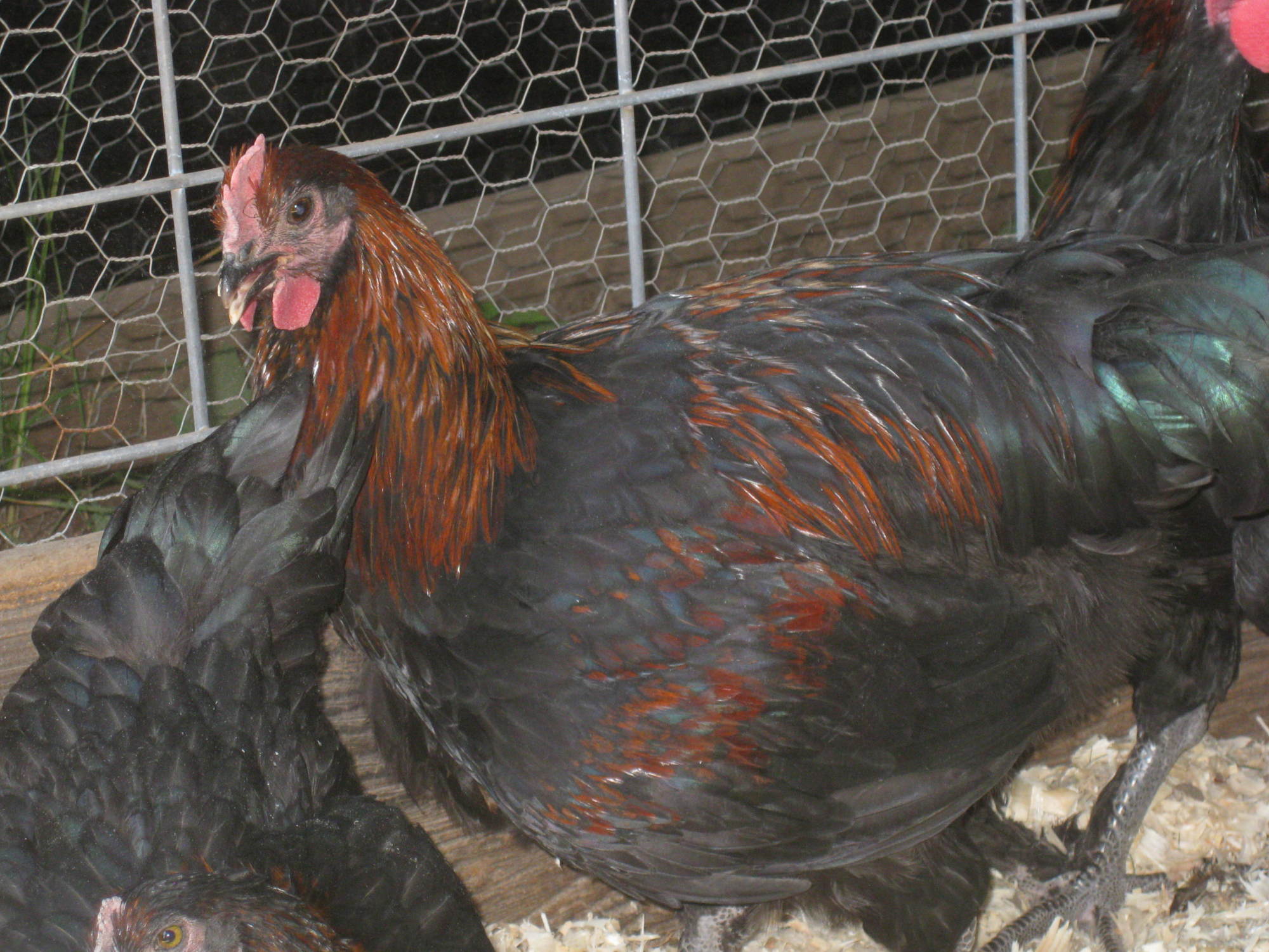 Hi Everyone, I am a newby to Marans, having fallen in love with the eggs at a show last year. I hatched out a dozen eggs that I got on ebay (said to be from Wade Jean and Cottage Hill lines) this winter. They are almost 4 months old (15 weeks). I have some questions. I have two different color eyes out there, lighter and very dark. I am posting photos. The light eyes are not nearly as light as they look in the photos, they are not yellow,but more of a red/green. I also have two pullets I think have way too much copper down their necks, Also posting a cockerel photo for your input into where he stands in wing color. I know they are young, and are changing fast. I just want to know what your thoughts are. Thank you so much for looking!