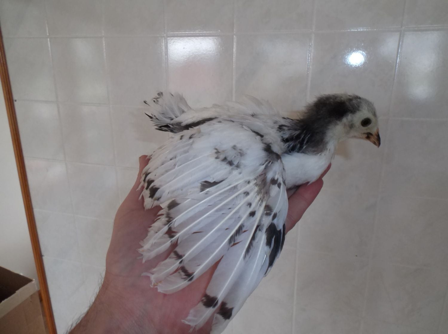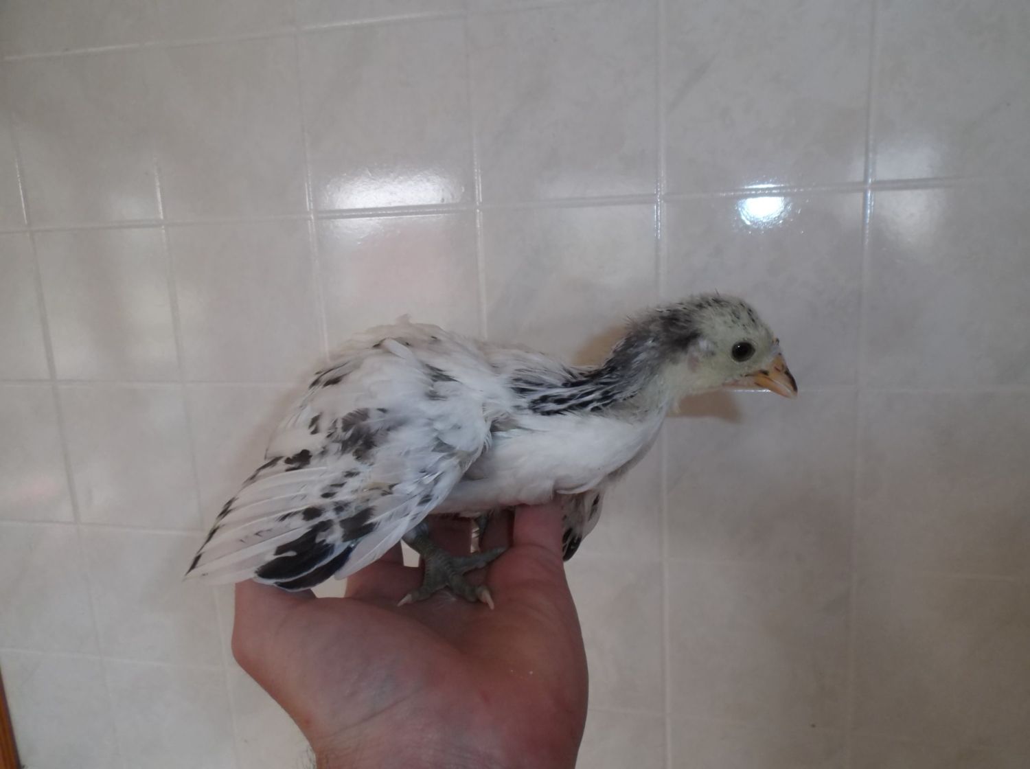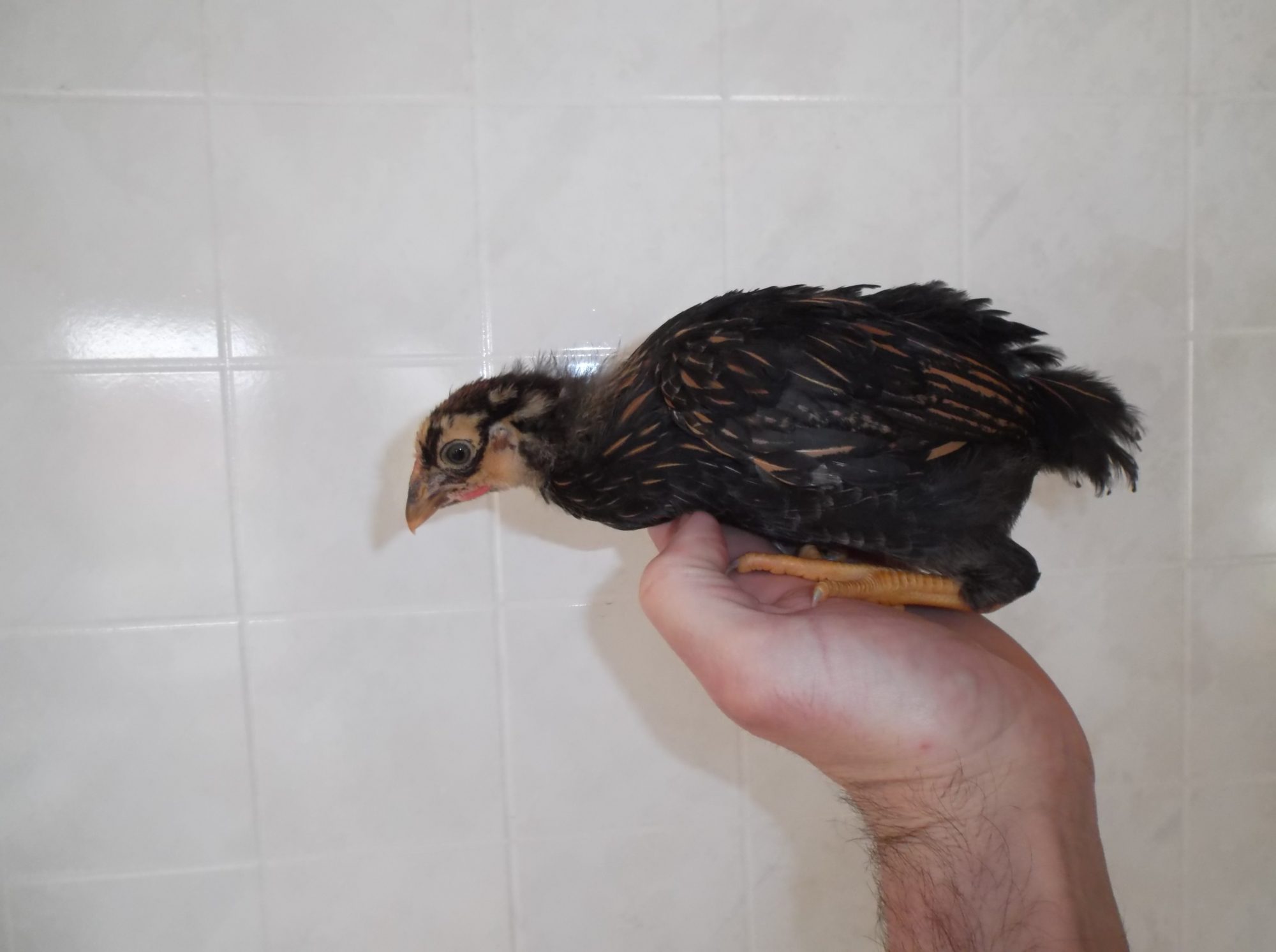 This is Ninja. It was all black with a white spot on its head early on. It had pretty bad paste problems but we got it under control and now seems healthy.