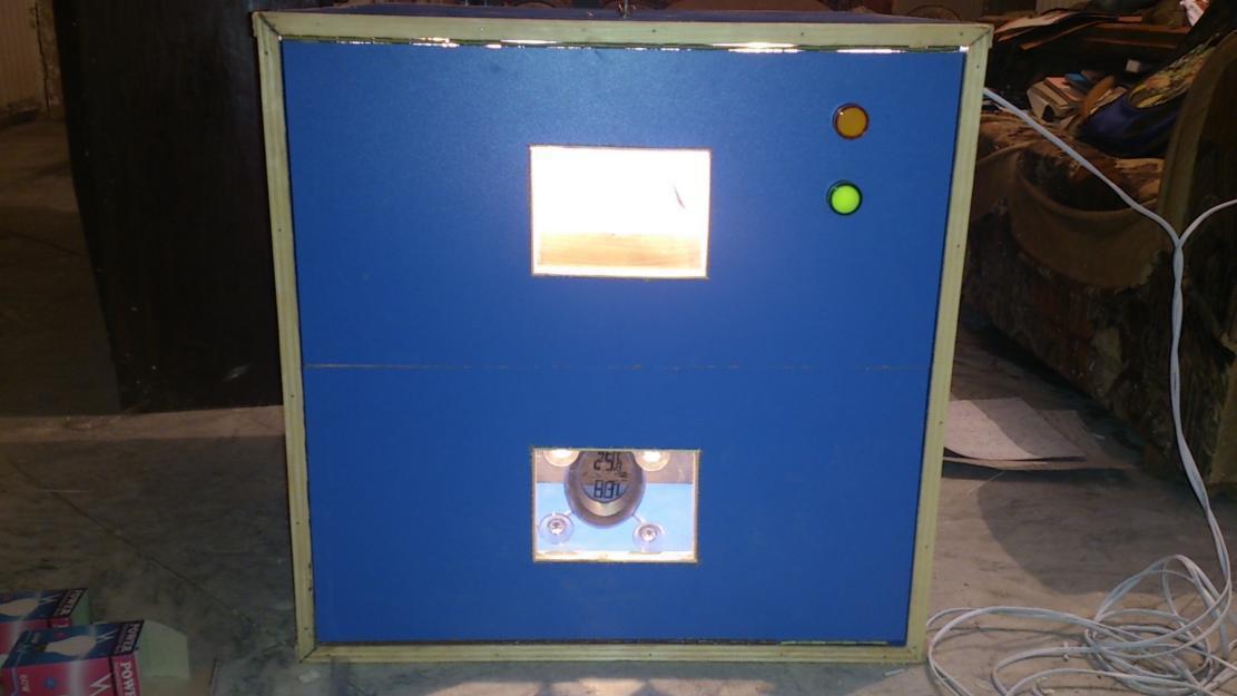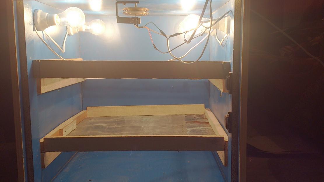 I would put 2 desk fans in the incubator. One blowing air down across the light bulbs to the thermostat, and one on the back wall with a small 1/2 inch hole to pull in some fresh air, and make it pointing downward to the shelves.