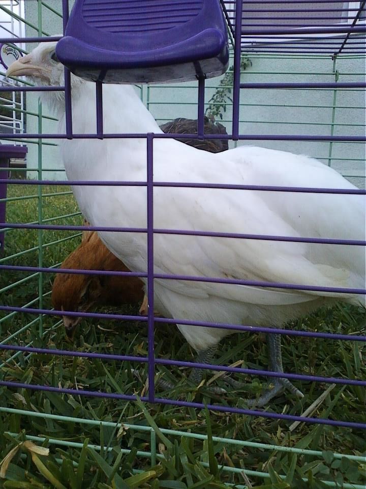 this ones name is marshmellow peep. she has legs like the amercanas grey/blue but i have no clue what kind she is. she also has a black spot on her wing.