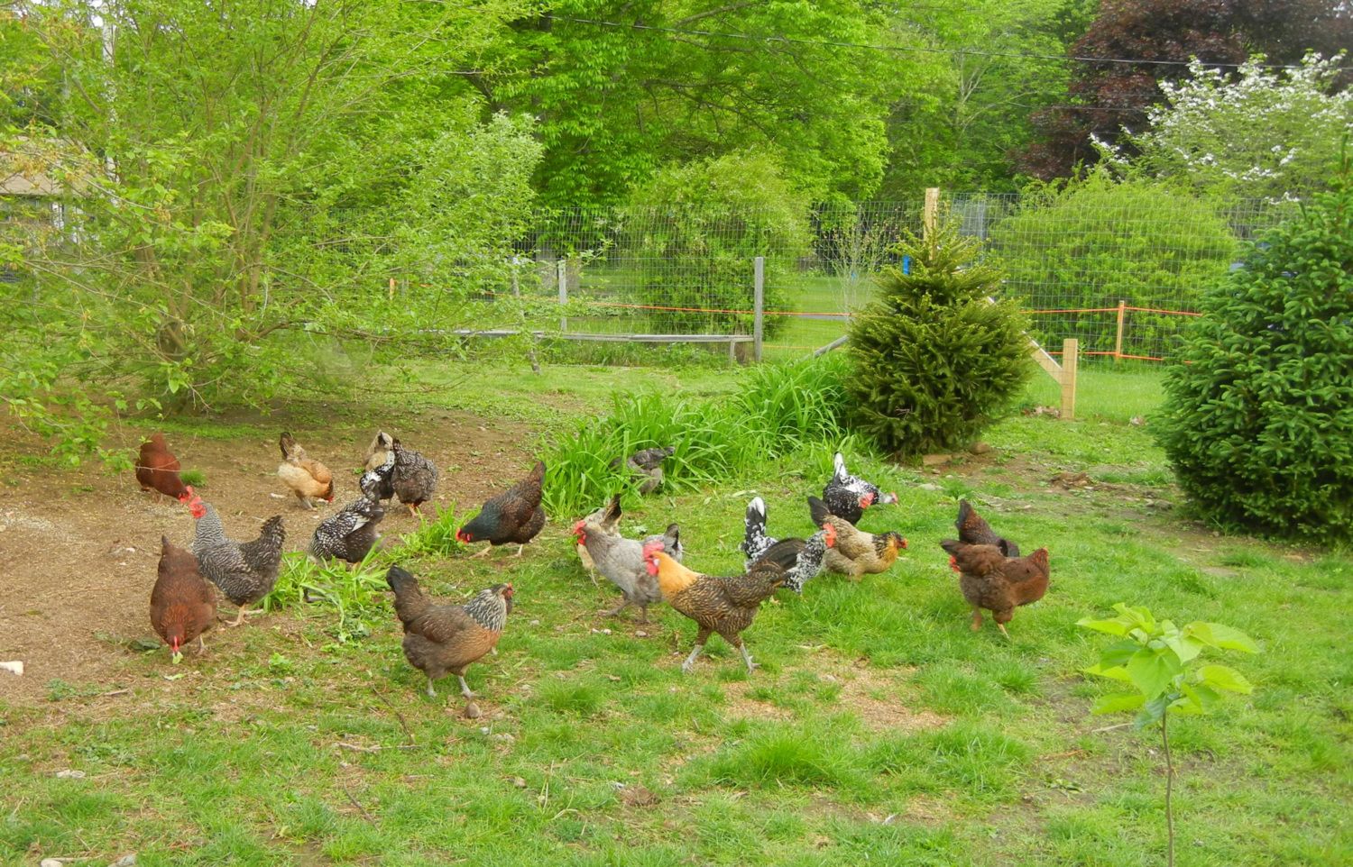 Spock is a pretty nice guy.... he lives with 23 hens. He has never shown any serious aggression towards me or any of the hens. All but six of the hens are older than he is. He began living with them at about 8 weeks I believe. The new guy is with a group of 6 pullets. Here is Spock with most of his girls. The orange tape is the property line!