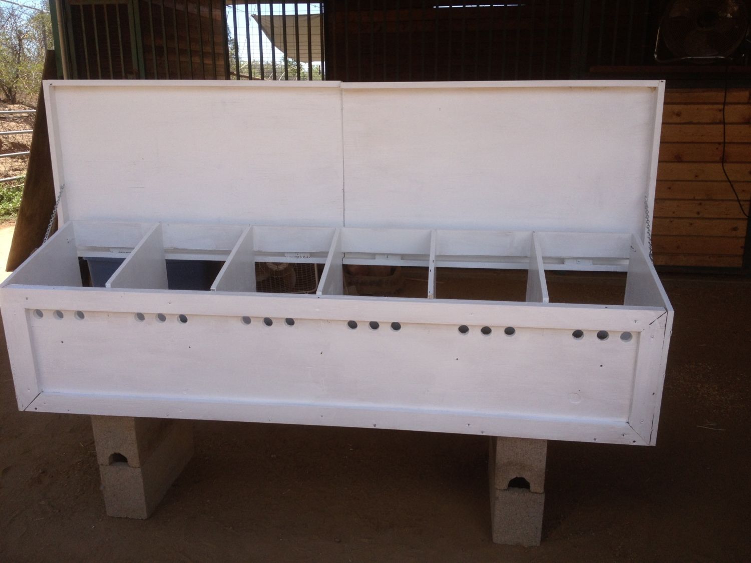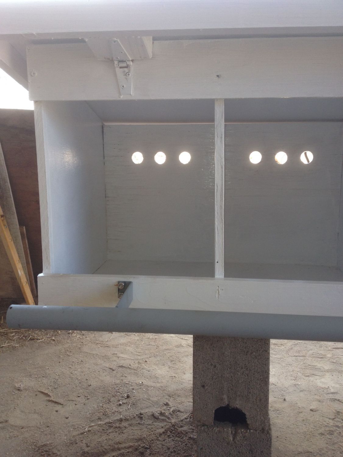 We also put a landing bar (fence top rail) on the front to keep the gals from jumping in on the eggs or roosting on the edge.