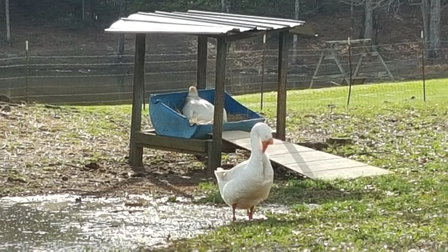 We have an acre lot fenced with woven wire and inside that we have a large chicken/turkey house that has a smaller lot fenced that is attached. We let the chickens and turkeys out so they can roam around the acre lot. Also inside the are lot is a small pond where my geese stay. We have a large pond outside the fenced area where the ducks stay, but the geese seem to like to stay in the acre lot. So we have three of the half barrel for nesting thinking each turkey and the goose would use one, but all are using the same one.