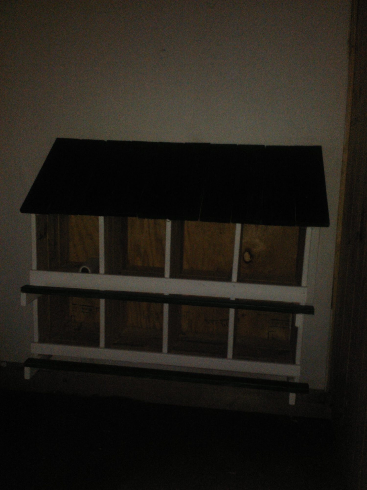 These are my nest boxes. The rabbit hutch is usually a nest box too, but it doubles as isolation quarters for new flock members after they have passed their health screening. They are in the same coop, but protected from being picked on. When it is being used for a nest box, the wooden door is a ramp, and the mounted bowls have oyster shell in them. All I did to the litter boxes was take the plastic door off, because my girls hated them and wouldn't use them.