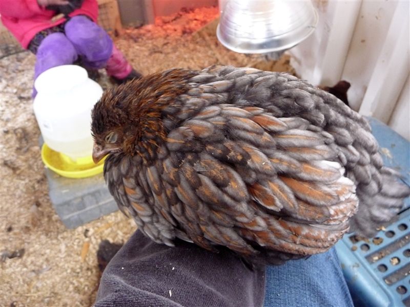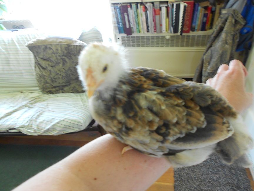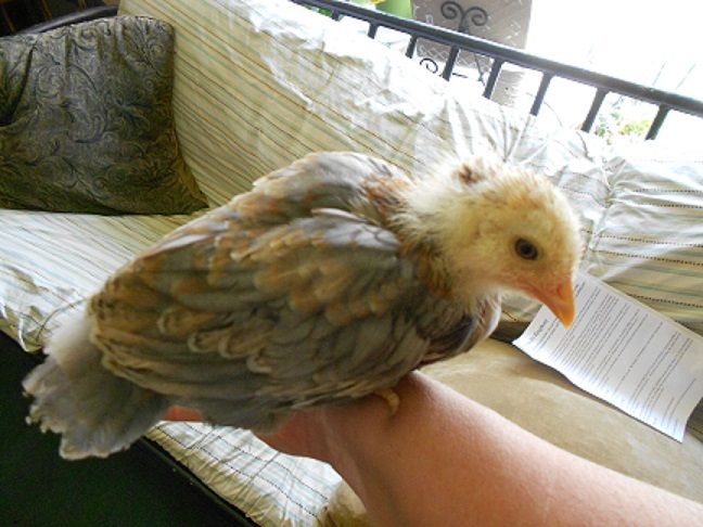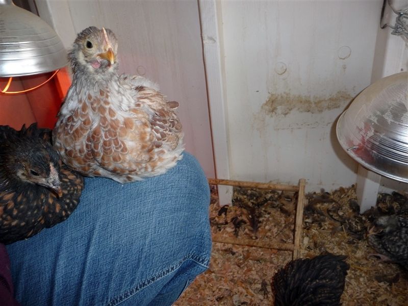 Sunny I have to tell you the chicks we got from you are great. They're so sweet with people. I think I'm going to name the little lav roo you gave me Peregrine. He kind of looks like a hawk because of his eyes, and if I scratch under his chin he climbs up and sits on my shoulder. LOL. He sat there while I did my rounds last night (putting up my girls, feeding the horse, etc.) Then he settled back down with the little split girl you gave me and went to sleep. I had my babies on our bedroom porch yesterday in the sun, and two leghorn girls flew over the rail to steal their feed (they could care less about the chicks) and he ran after them chasing them straight off the porch. I laughed so hard I cried. here was this sweet little Roo that calmly lets my two year old pet him and he had no issues or thoughts at all about chasing my big girls away from his little hens.