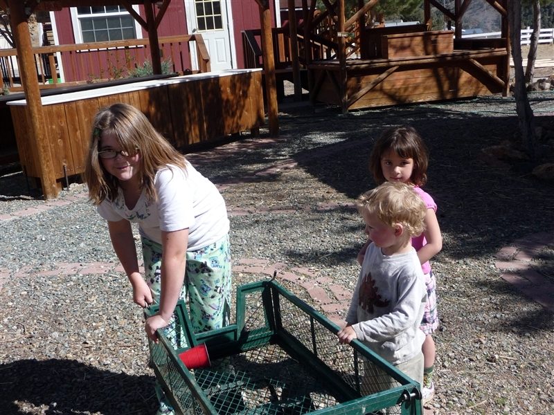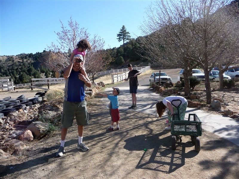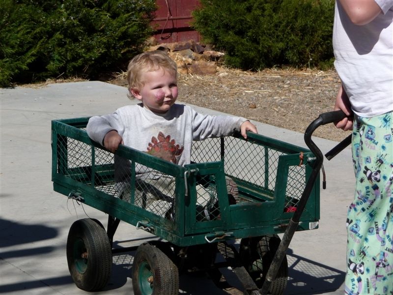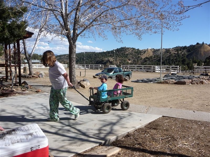 Missy's daughter is pulling the wagon. My daughter and Mandy's younger son are standing by for a ride.