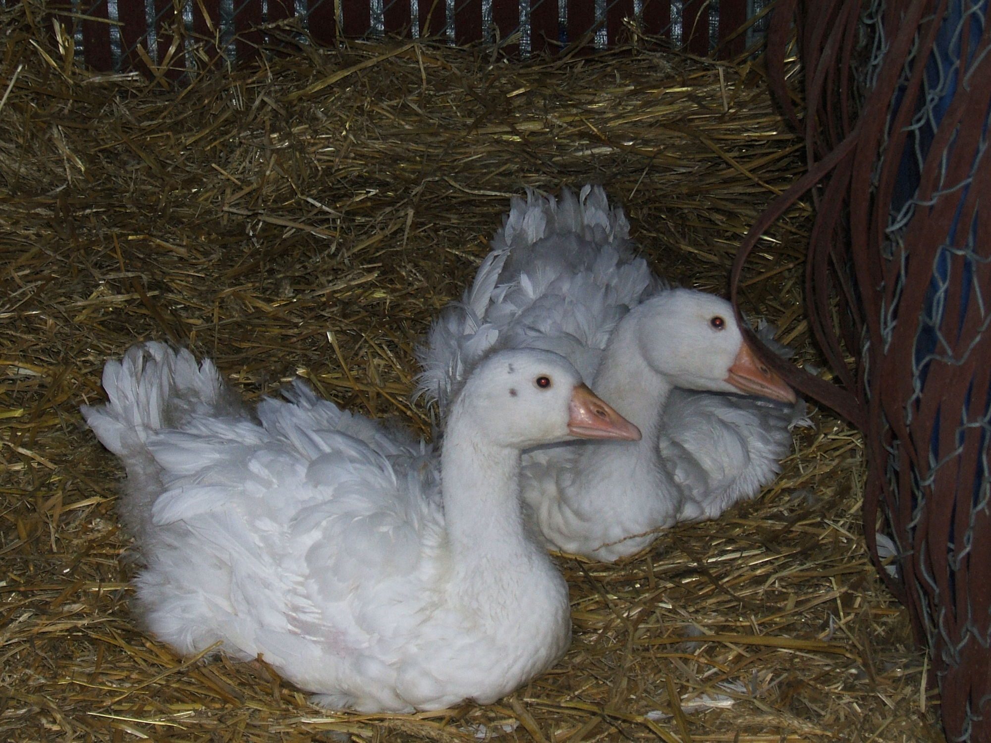 Heathers Sebastapol goslings, hatched Easter weekend, they are very tame and the male, Elvis,  will sit in her lap, the female Marilyn stays just out of reach but will nibble on your clothes when you are not looking :)