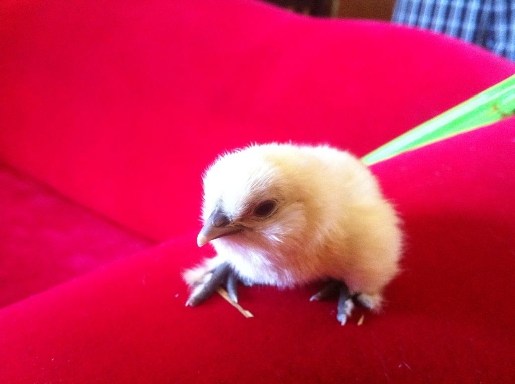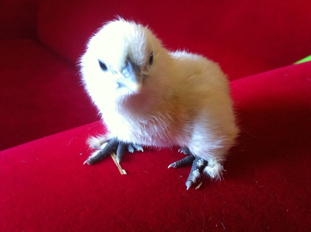 Now i am using my best chicken expertise to say that Mr. Pants mustve made this one with Dolly Parton, the white silkie to get this little fluff ball. Just look at those little black feetsies!