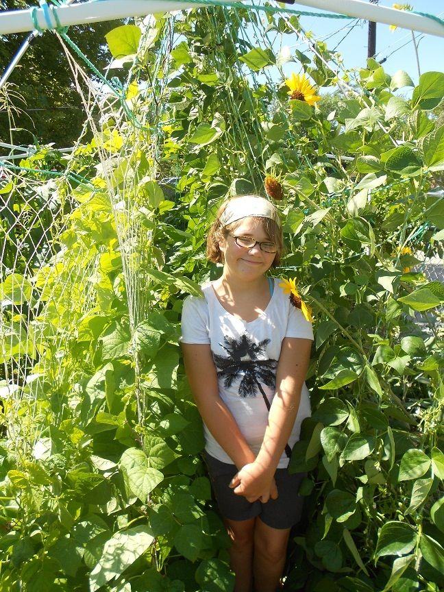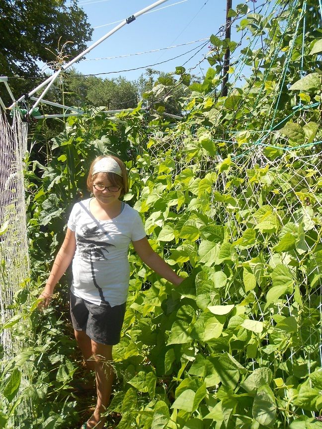 Actually, the beans on the far left are storebought yardlong beans, grown only up to Sahara's waist. Next over, the lighter green, are storebought Kentucky Wonder green beans. And the ones that climb all the way to the top of the pavilion? Yeah, those are from Sheryl. The Kentucky Wonders only reach the top of that white net. Everything above them are Sheryl's.