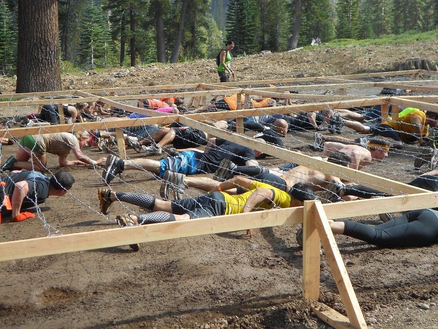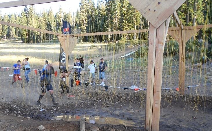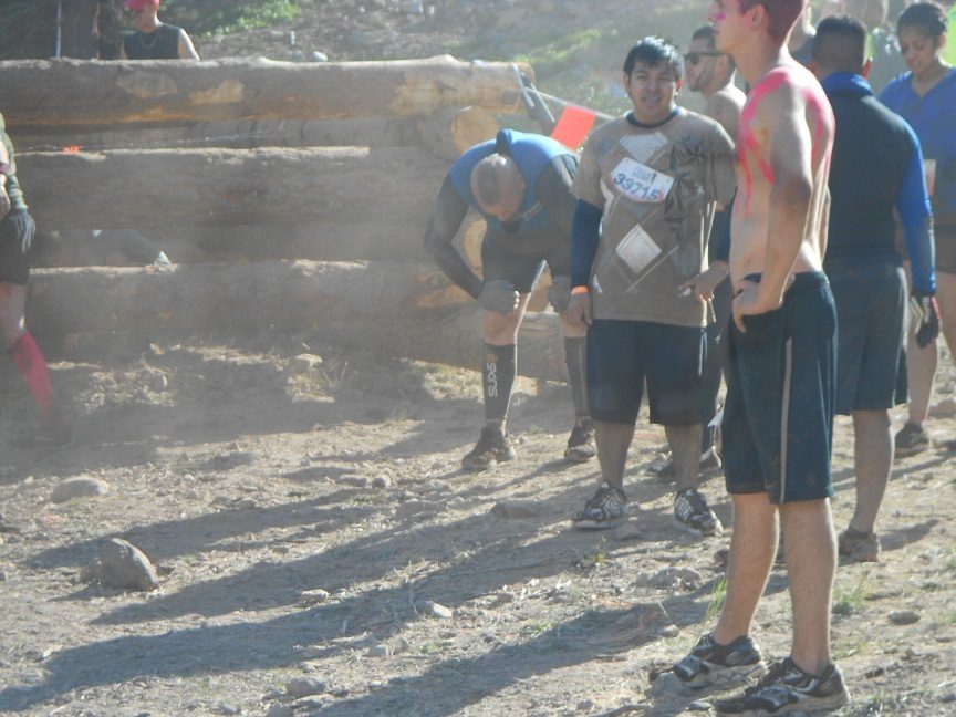 The last obstacle in the course, one of the two with live electrical wires. Of course, everyone was wet and muddy by then, too. Near the end of this obstacle, Russ got hit with a wire and his muscles locked up, and he did a face-plant in the mud.