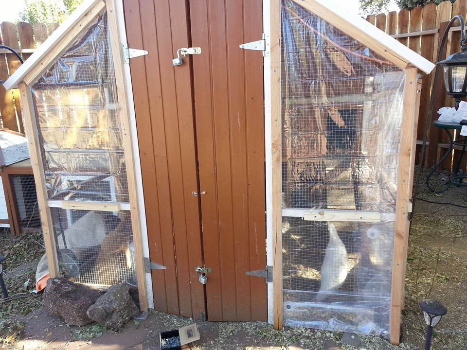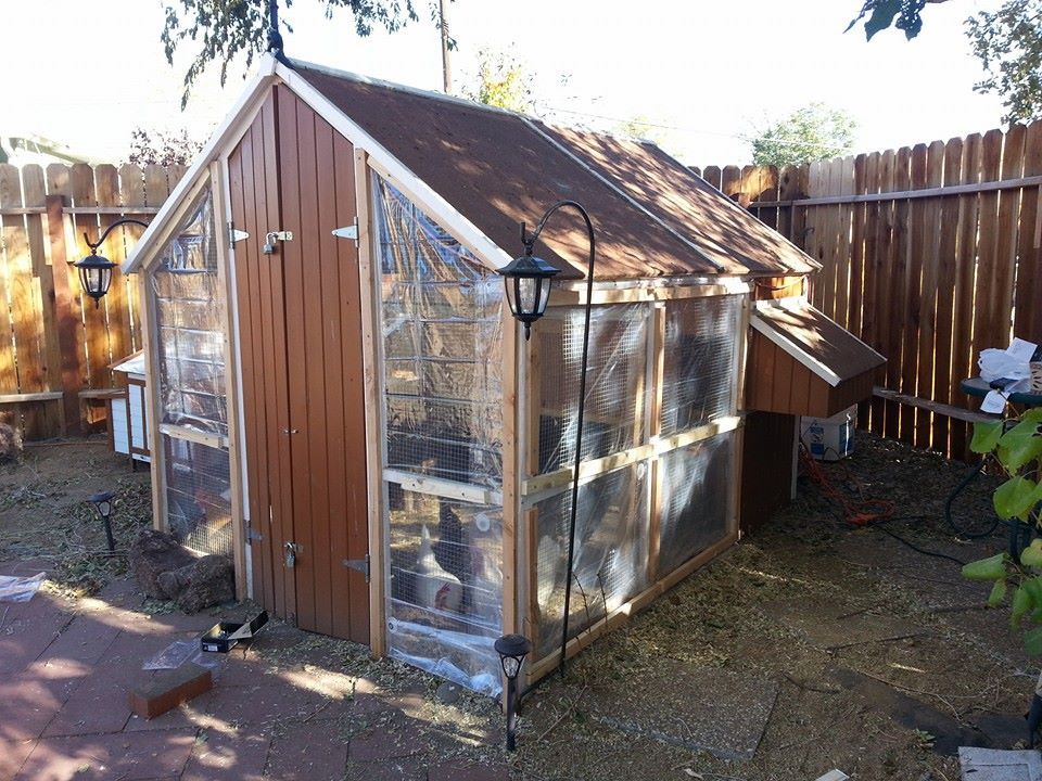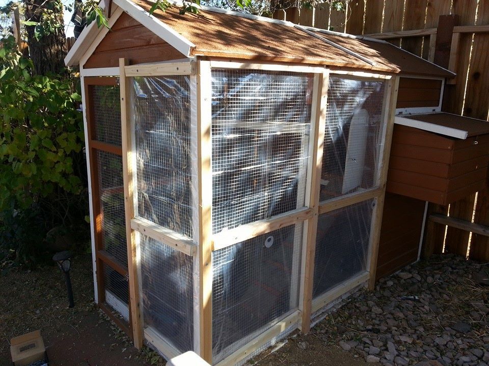 I covered my outside run with clear plastic, to let the sun in and keep the wind and weather off. I did not enclose the whole thing with plastic because of ventilation. My idiot ladies like to roost outside. I hope by blocking the winds and giving them a little bit of a green house effect that they will stay warm. I have no heat in the coops