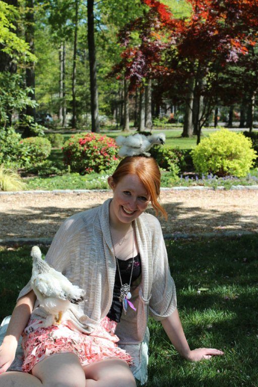 Here are the two girls that we haven't quite adopted yet with their present owner. I'm not brave enough to try this because the chicks I have seem to poop everywhere all the time without warning. Anyway, I'm not an expert, but the top one looks like a silkie... The other one looks bigger and similar, but I wondered if anyone had any ideas.