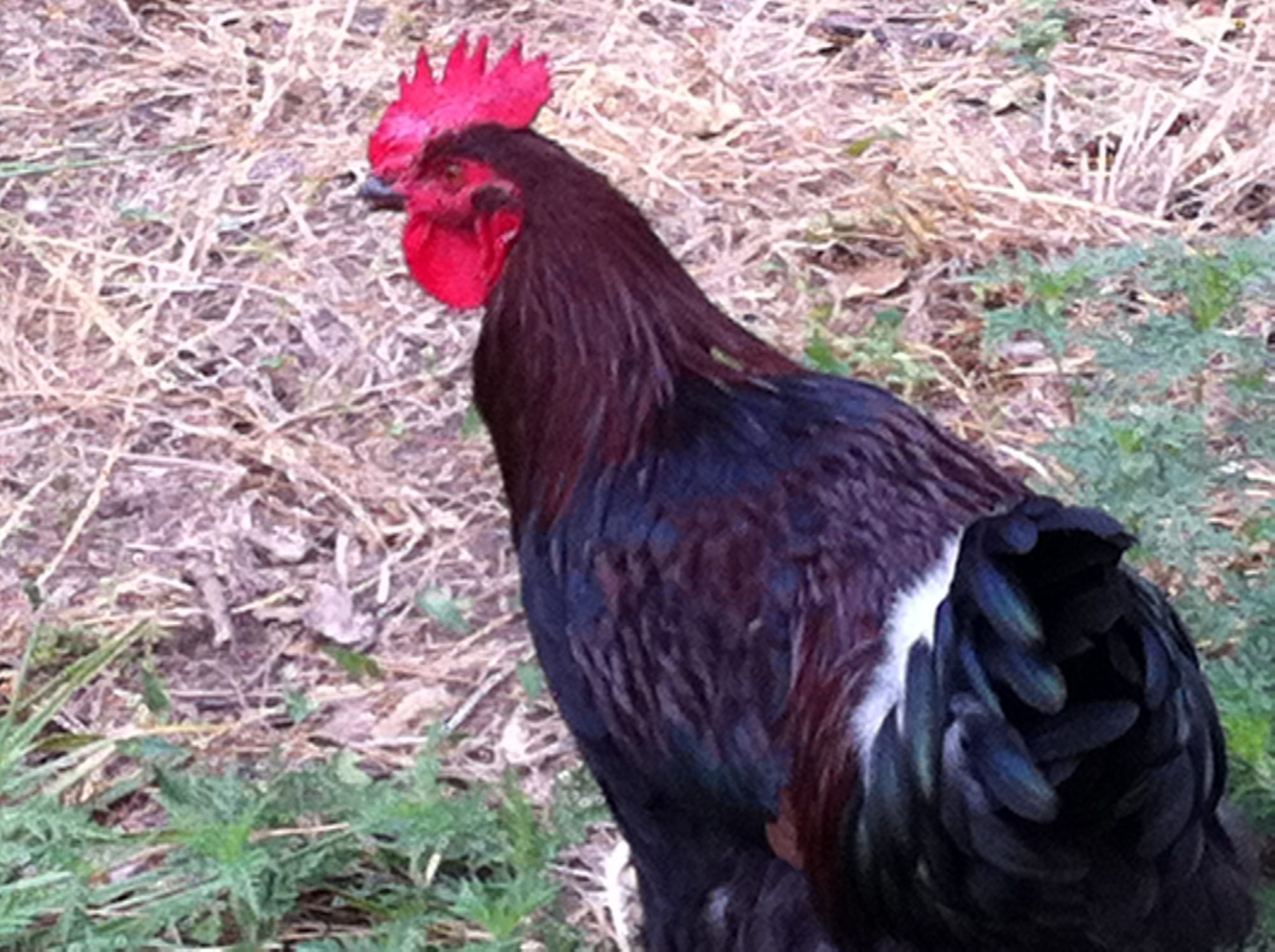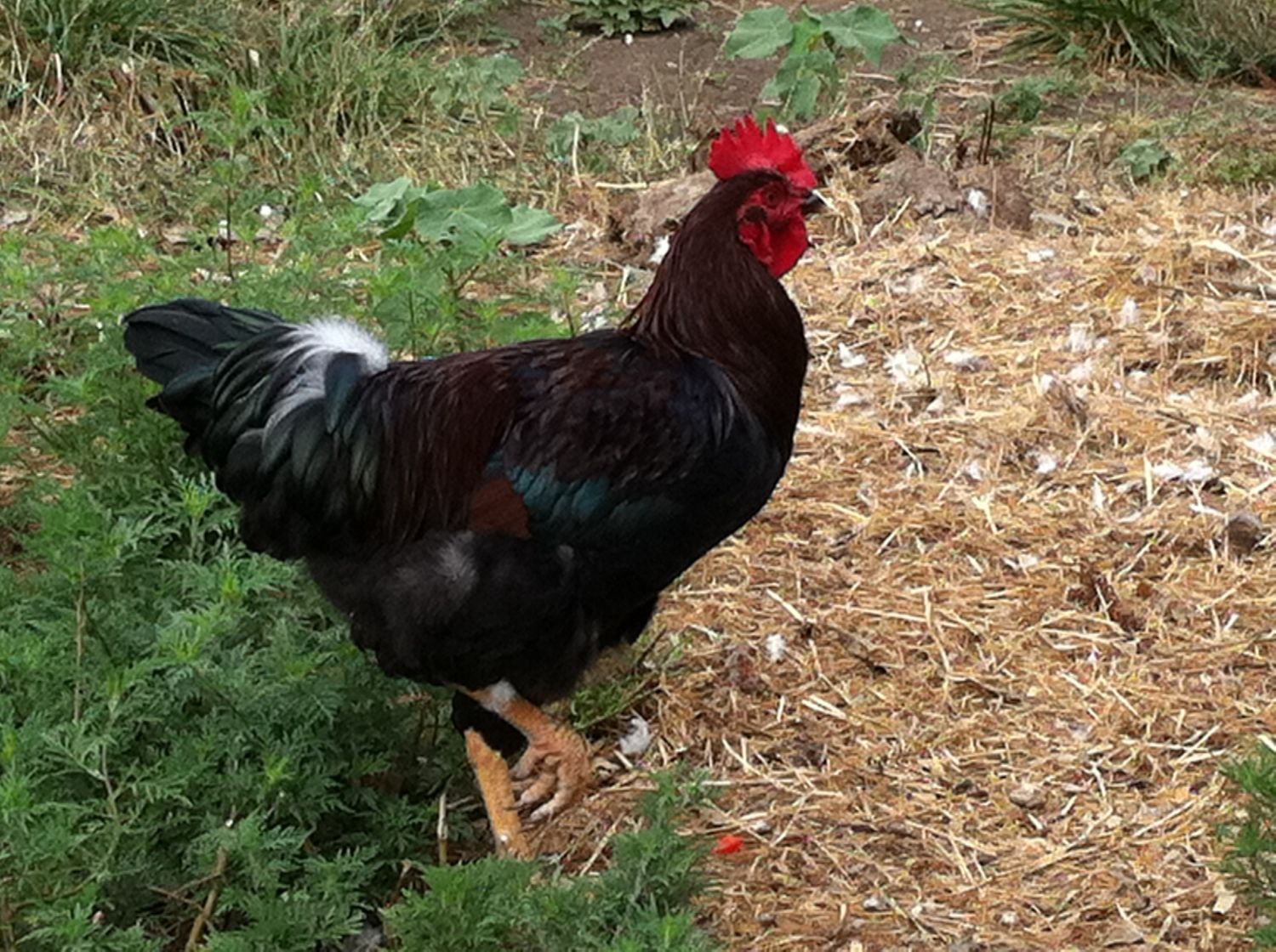 Hi! I posted a picture of one of our roos on the new member forum and had no luck identifying his breed so someone suggested I post a note on this forum to see if anyone could help. Reilly is a beautiful boy with iridescent green on his black feathers and he has a fluff of white feathers at the base of his tail. He is much quieter and calmer than our other roo (a barred rock). I've spent a lot of time looking on the internet and can't find anything so appreciate any help!