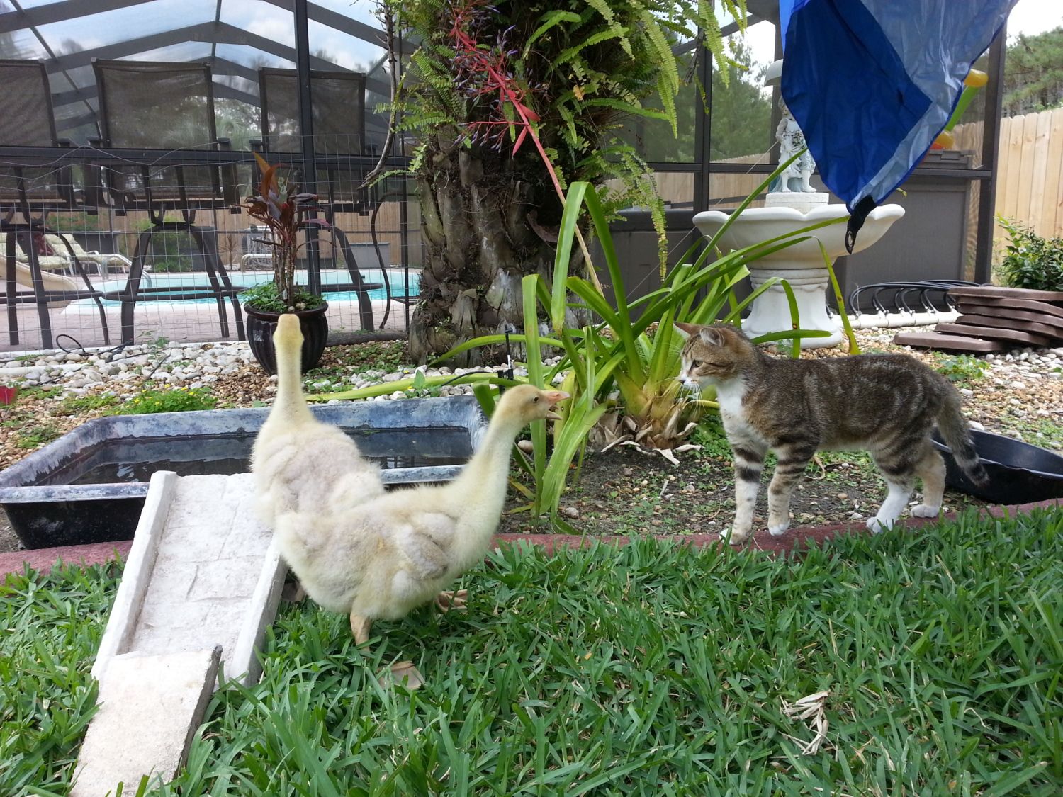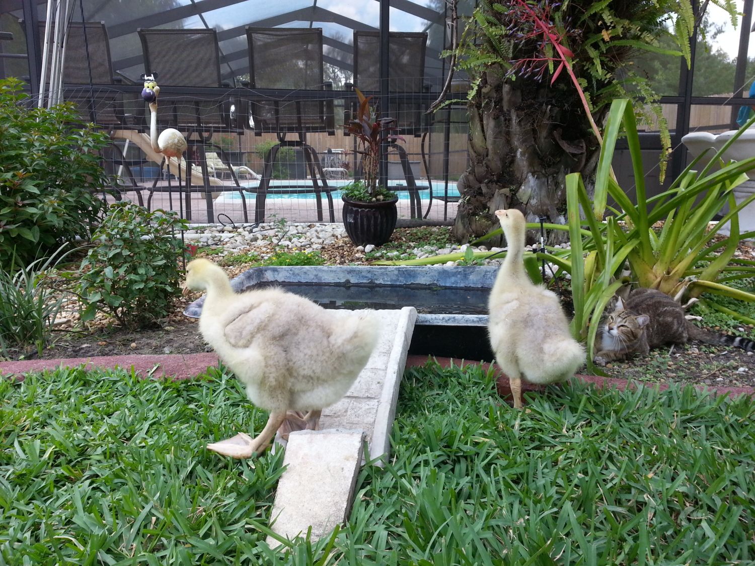 This is Olive up close and Brutus in the back. They have only drank out of the cement pan. No swimming yet.